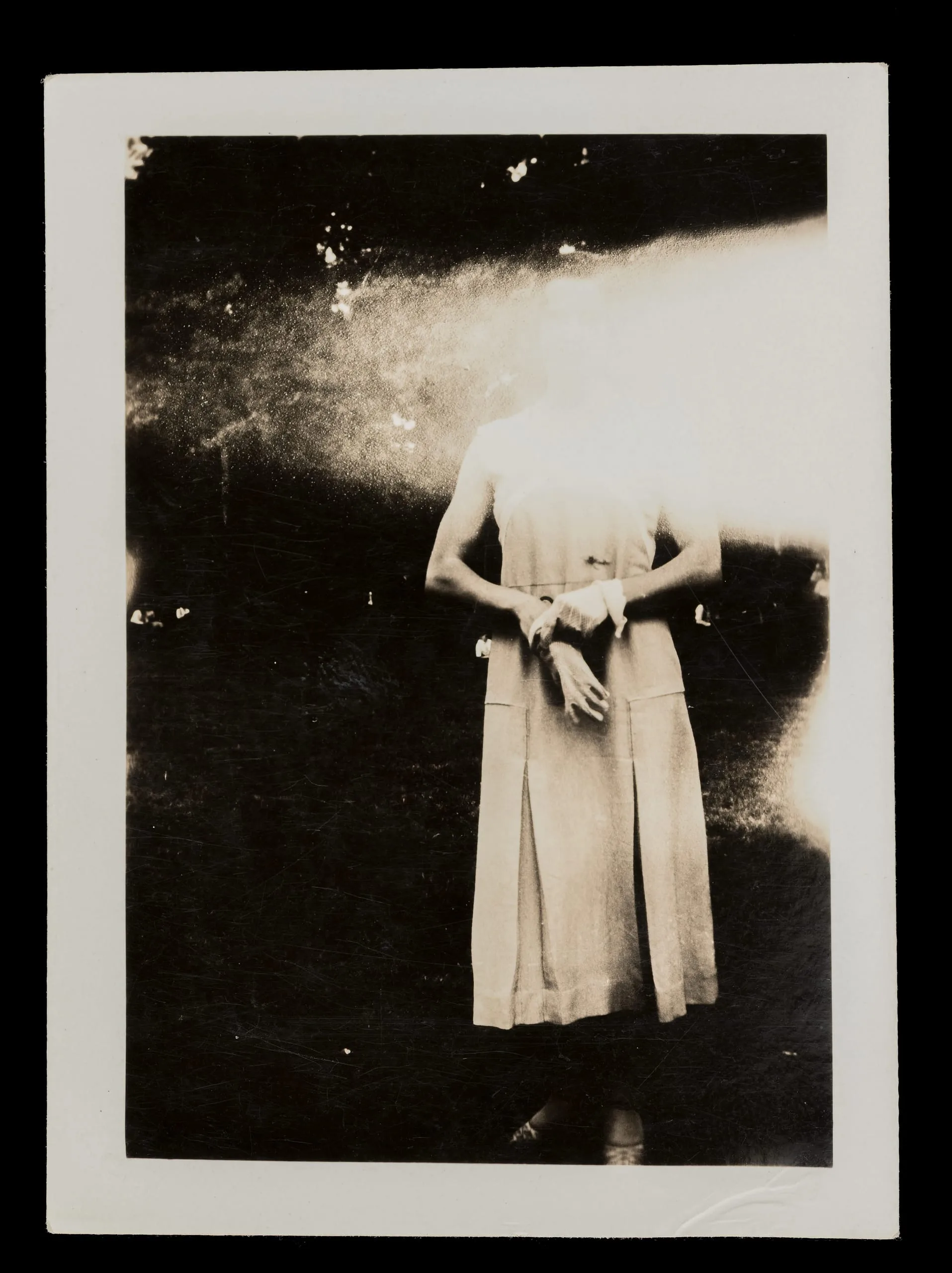 Sepia-toned photograph of a standing figure in a sleeveless light-colored dress, head and upper torso obliterated by a large bloom of white overexposure