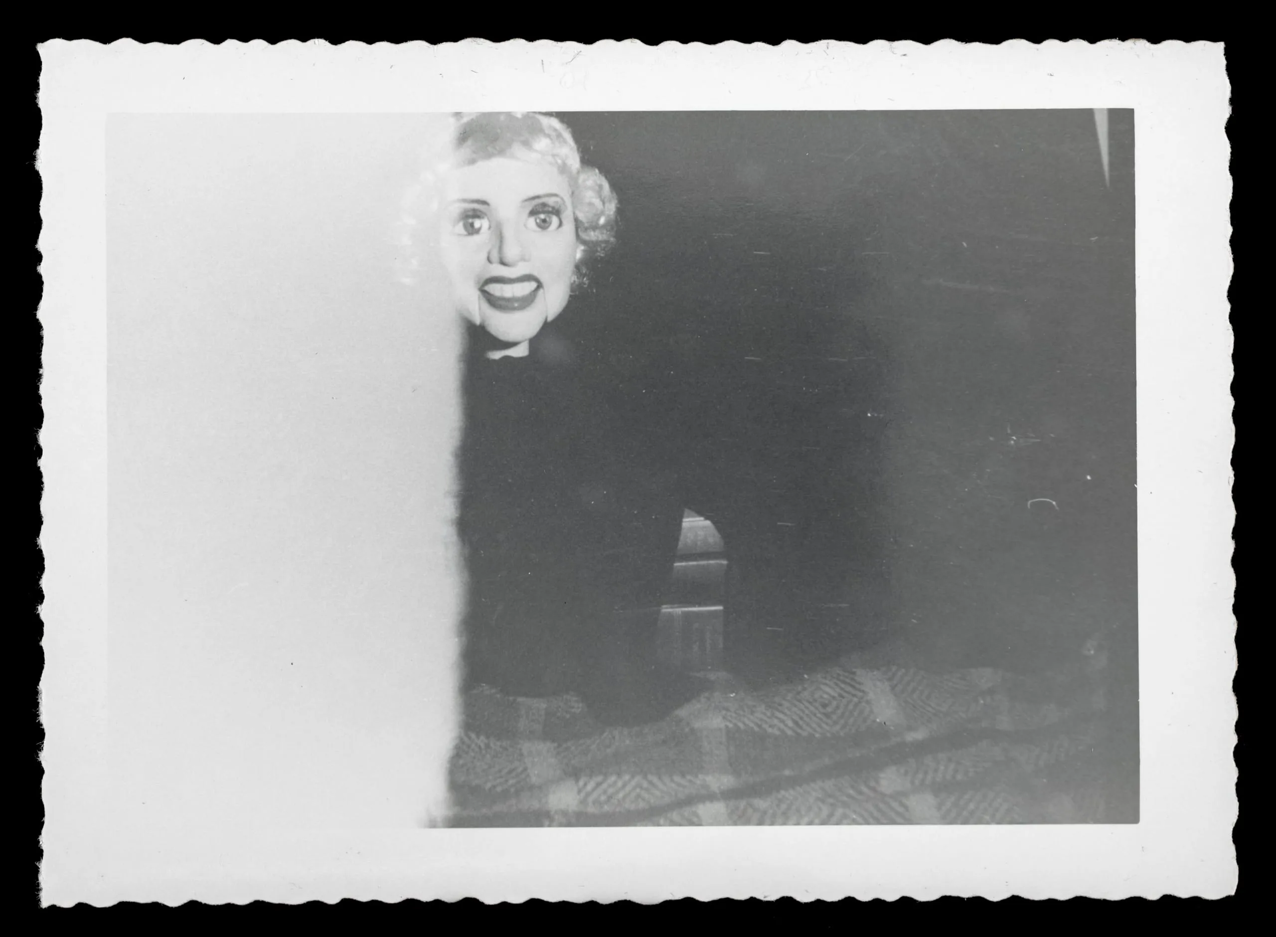 Black and white snapshot photograph of a pale, wide-eyed figure with curly blonde hair and an exaggerated smile peeking from behind a flat surface, possibly a mannequin or puppet
