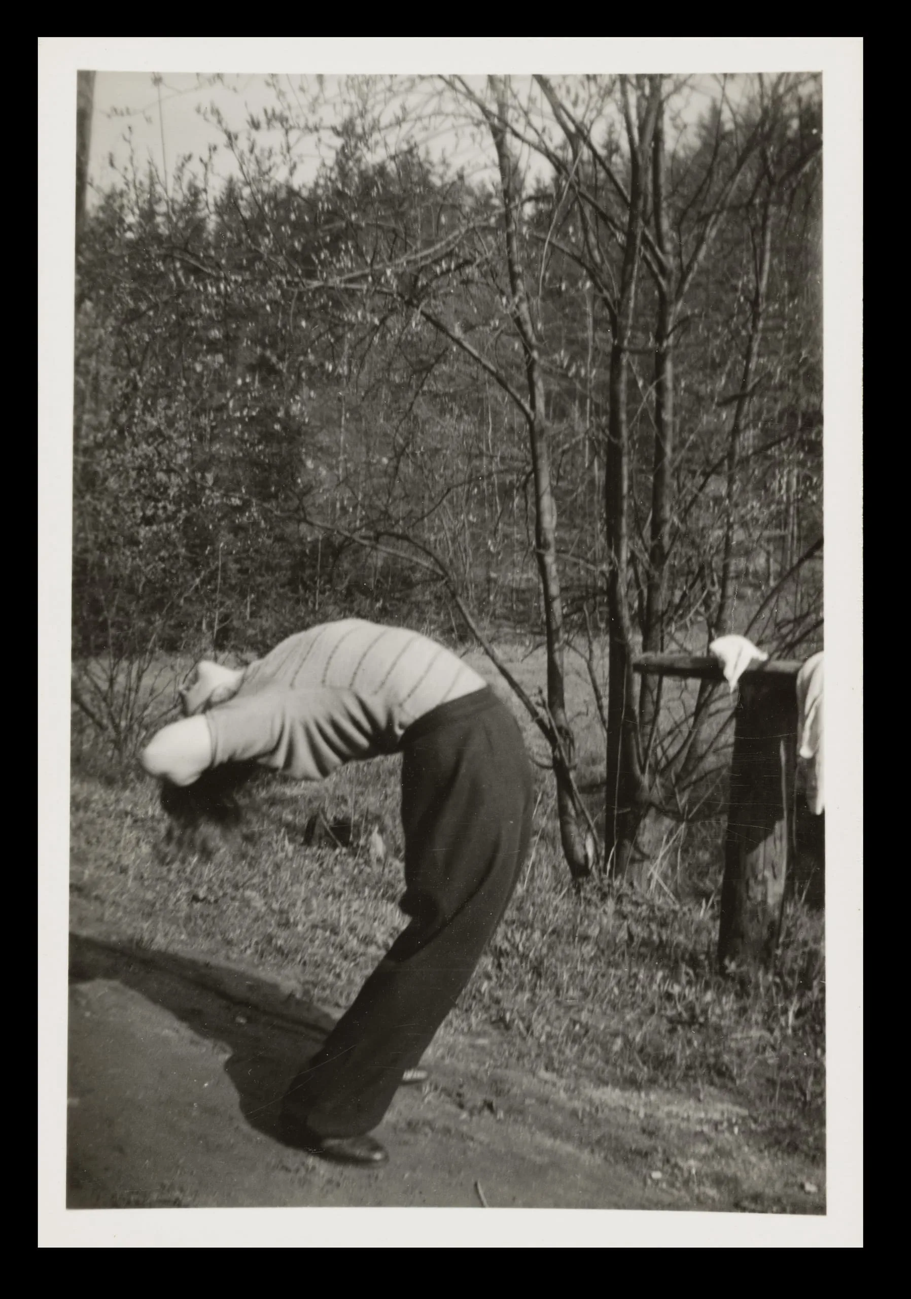 Black and white photograph of a person bent sharply forward at the waist outdoors on a paved path, wearing a striped sweater and dark trousers, with a wooded background