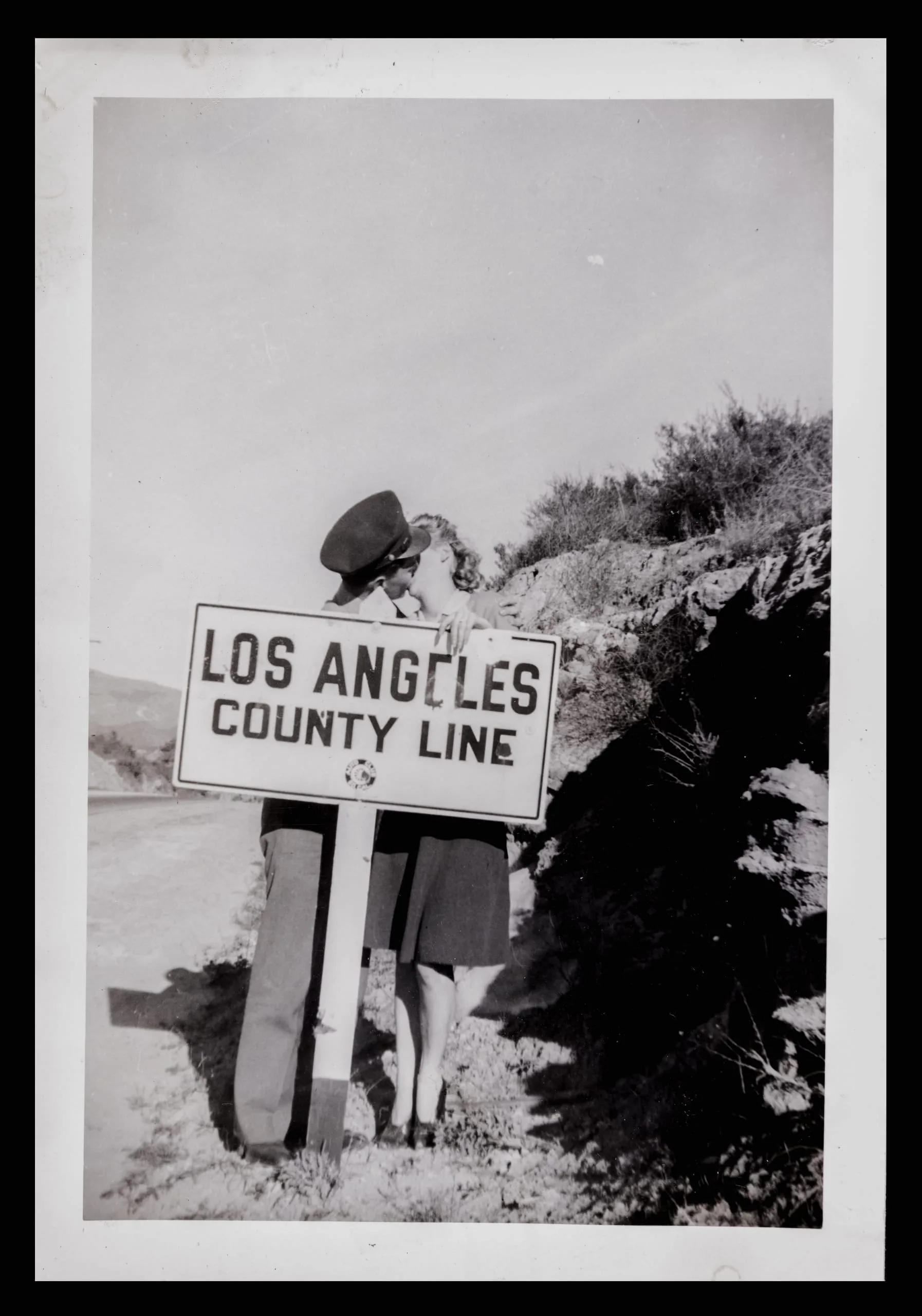 Black and white snapshot of two people kissing behind a 'Los Angeles County Line' roadside sign, rocky hillside and road visible in background