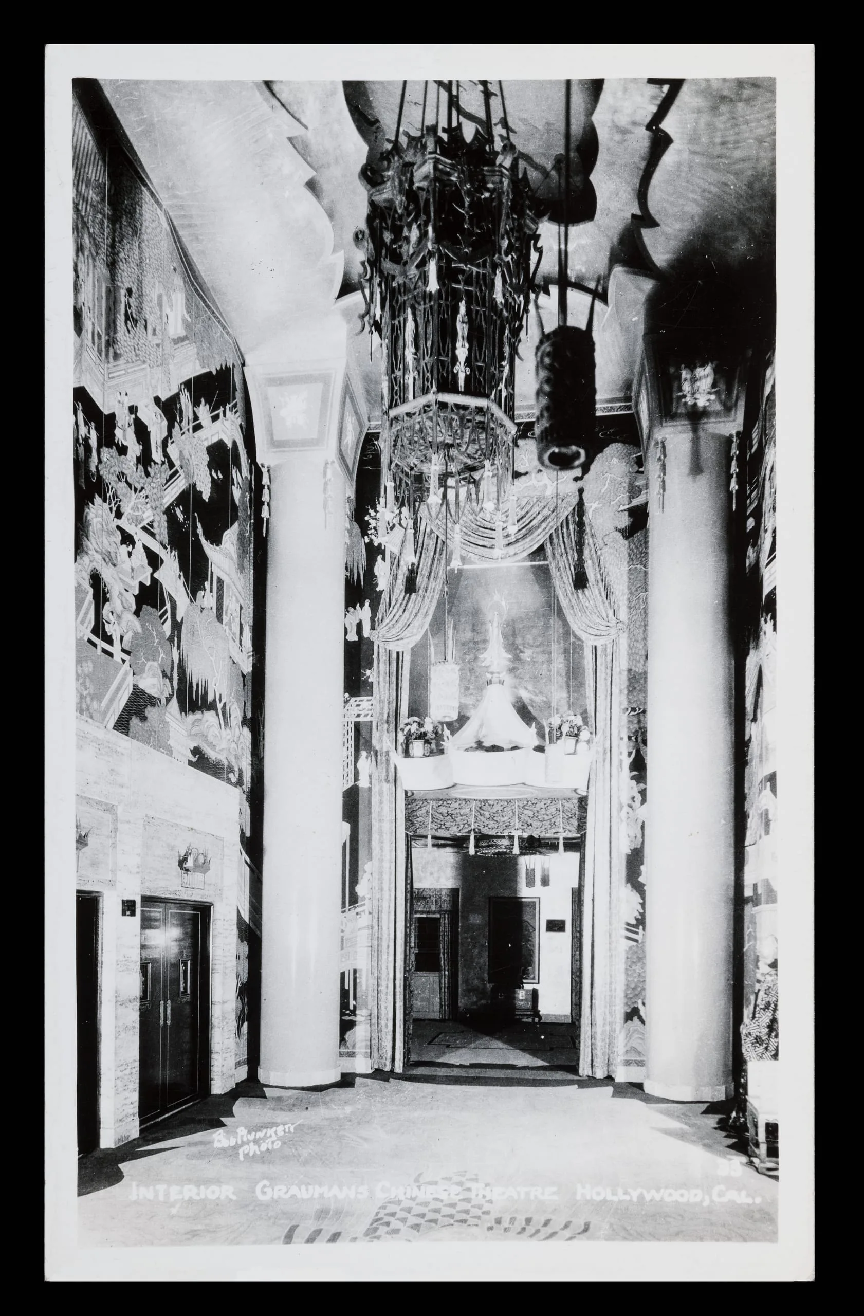 Black and white photograph of a theater lobby corridor with ornate Asian-inspired wall murals, large columns, and a crystal chandelier with draped fabric
