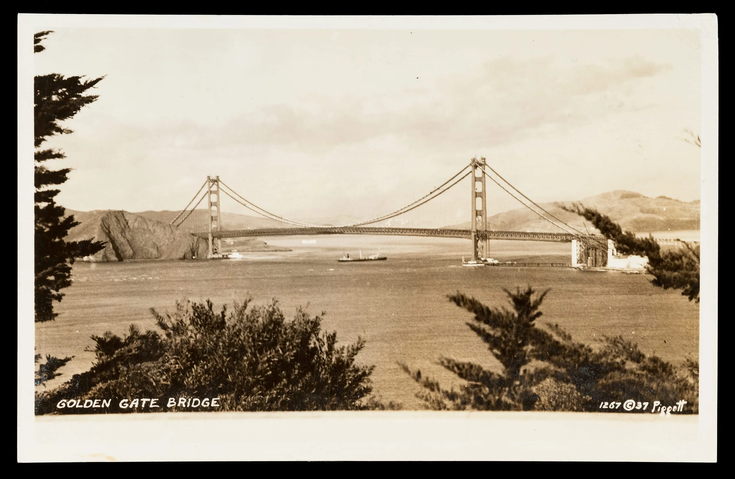 Sepia-toned photograph of the Golden Gate Bridge spanning calm water, framed by dark conifers, with hills in the distance and two ships on the bay
