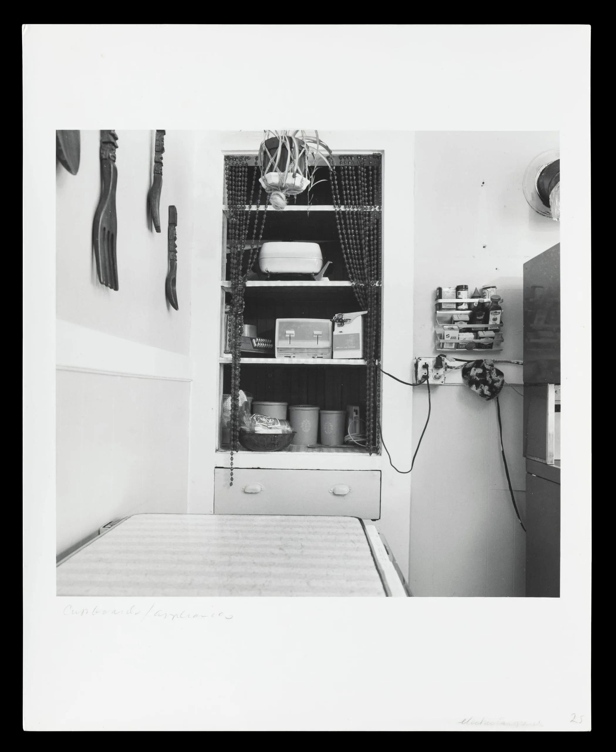 Black and white photograph of a small room interior with a shelved cabinet flanked by beaded curtains, carved wooden objects on the wall, and household items on shelves