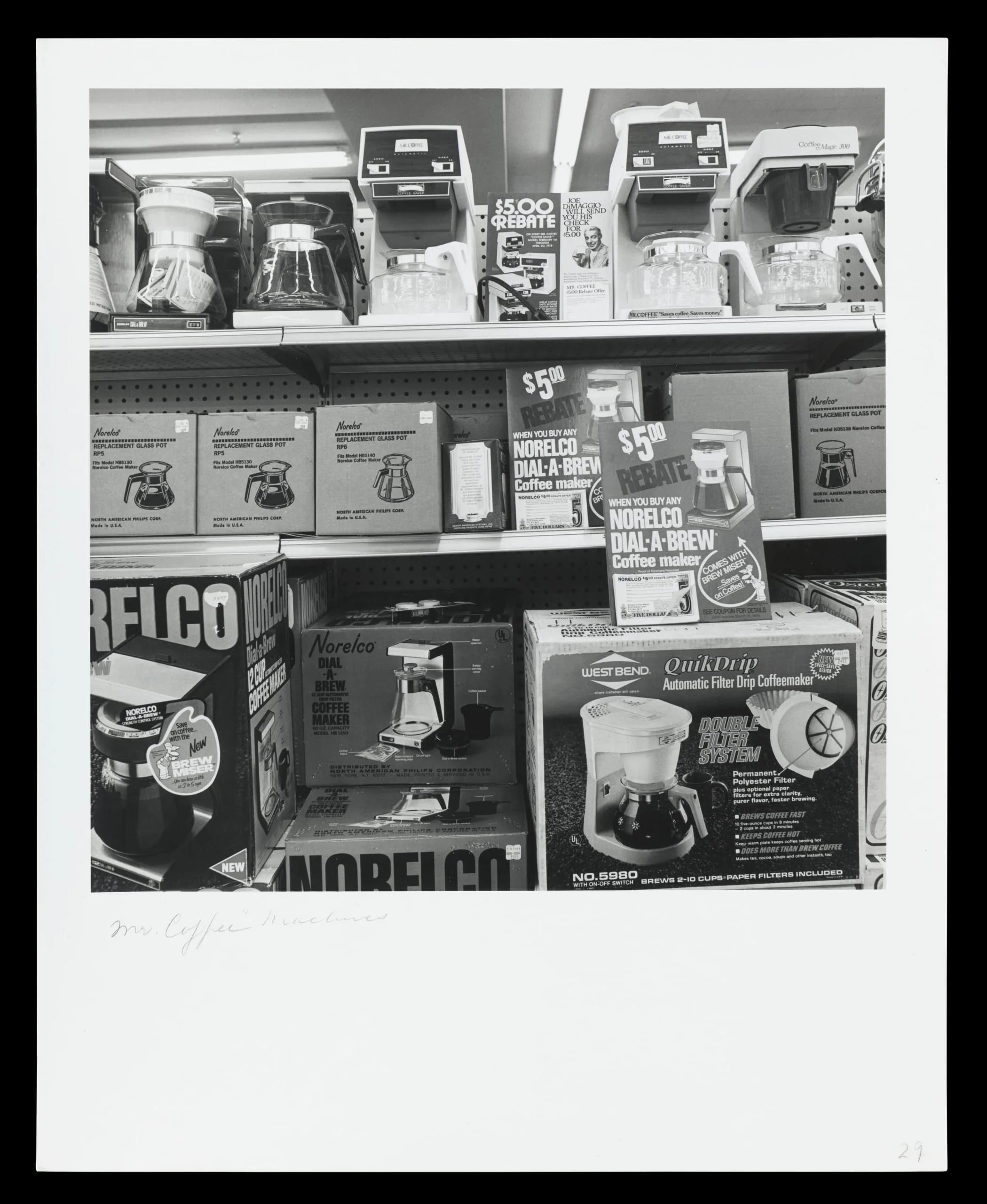 Black and white photograph of retail store shelves stocked with coffeemaker boxes, including Norelco and West Bend brands, with promotional rebate signs