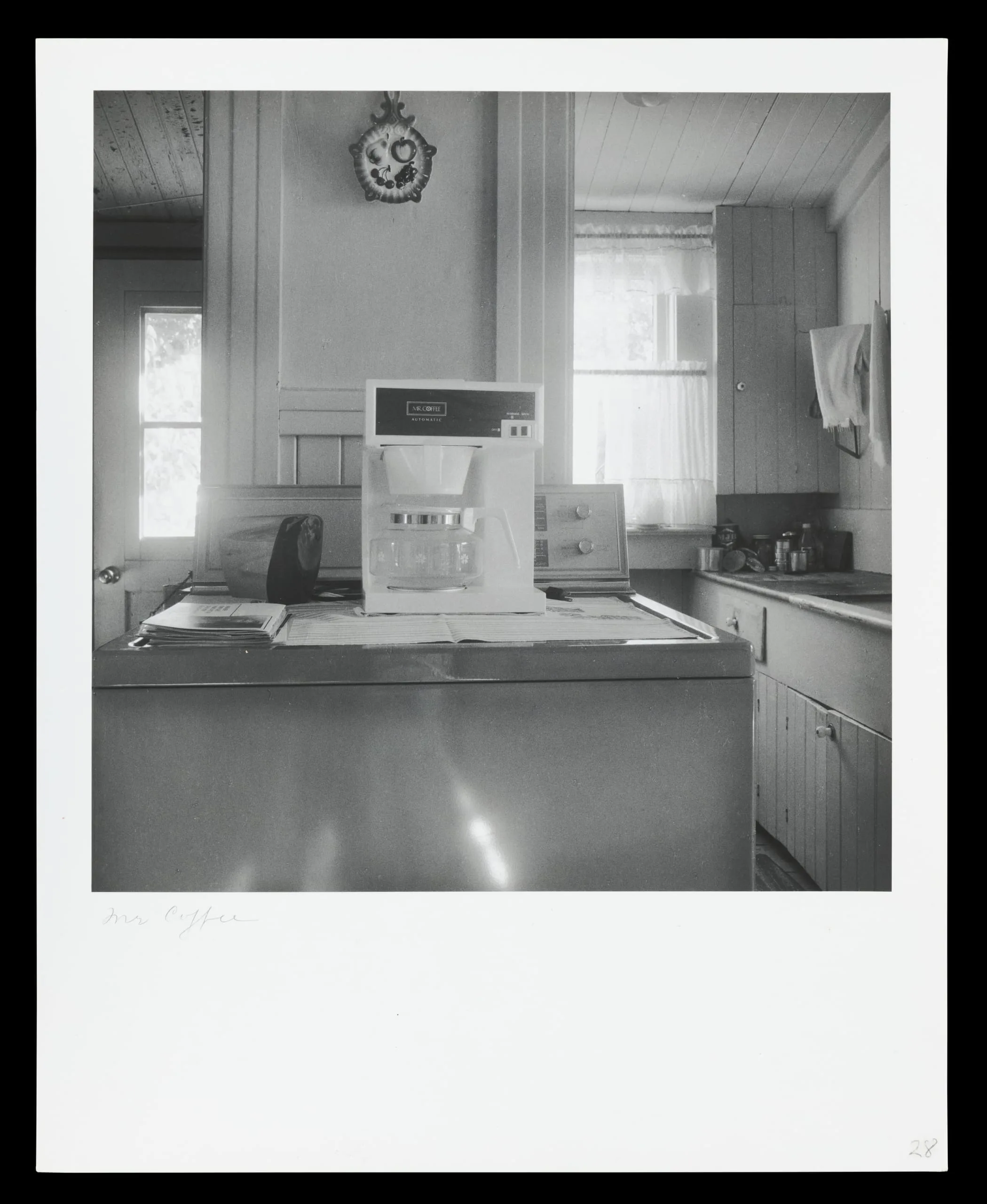 Black and white photograph of a kitchen interior, a boxed Mr. Coffee appliance centered on a flat surface with papers stacked alongside, two bright windows behind