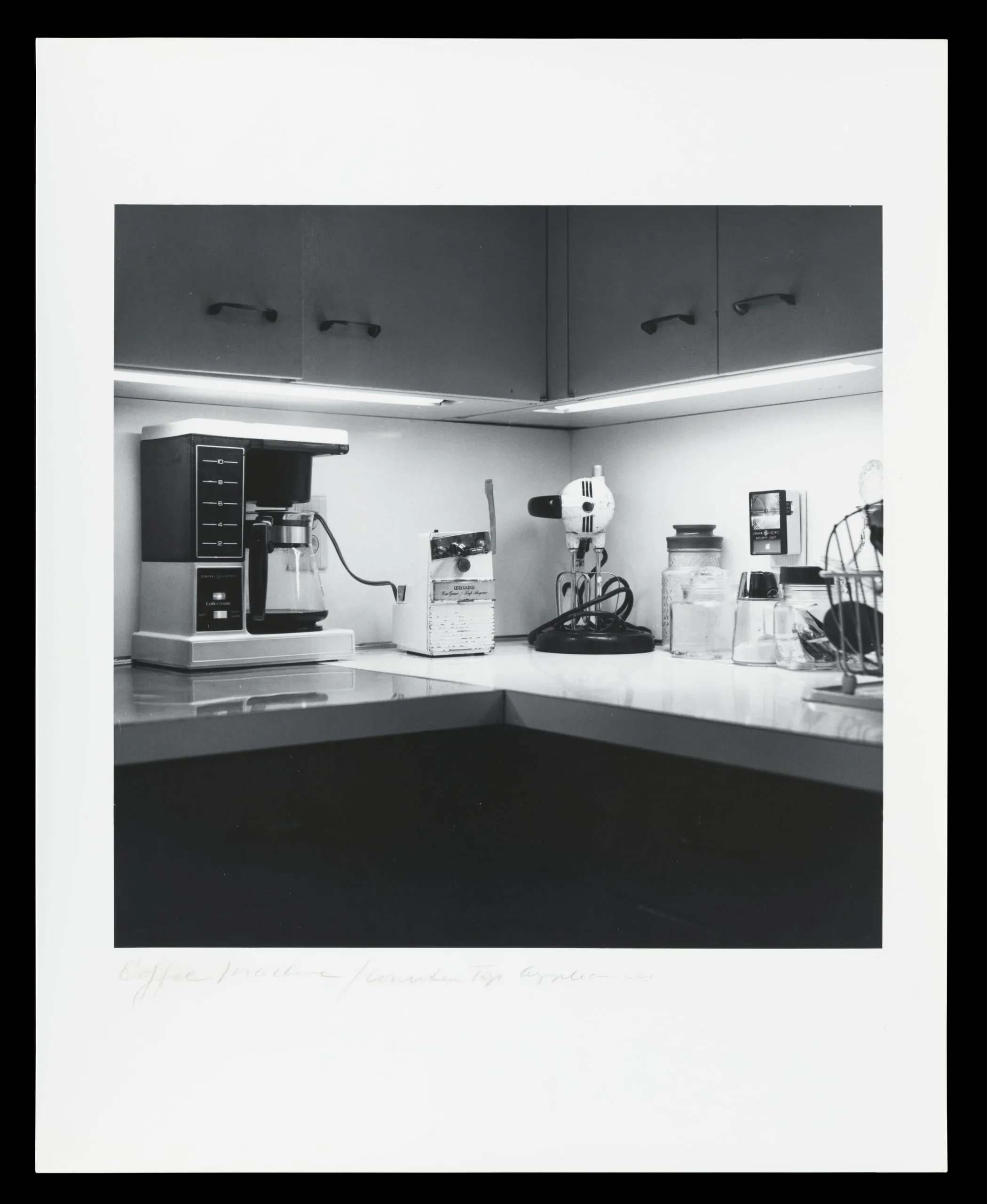 Black and white photograph of a kitchen counter corner with cabinets above, featuring a coffee maker, toaster, and glass canisters lined along a brightly lit backsplash
