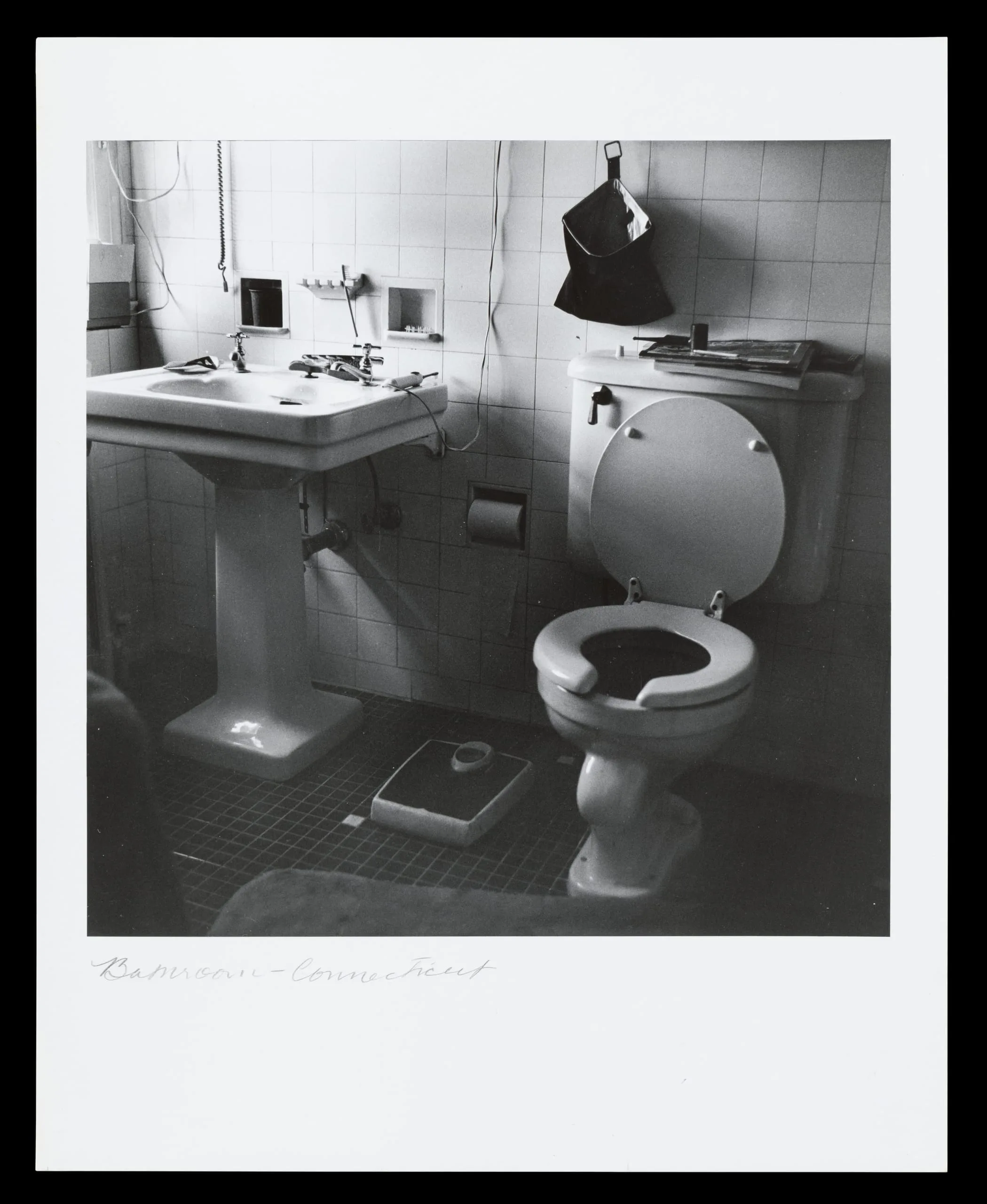 Black and white photograph of a tiled bathroom interior with pedestal sink, open-lidded toilet, floor scale, and handwritten caption reading 'Bathroom — Connecticut'