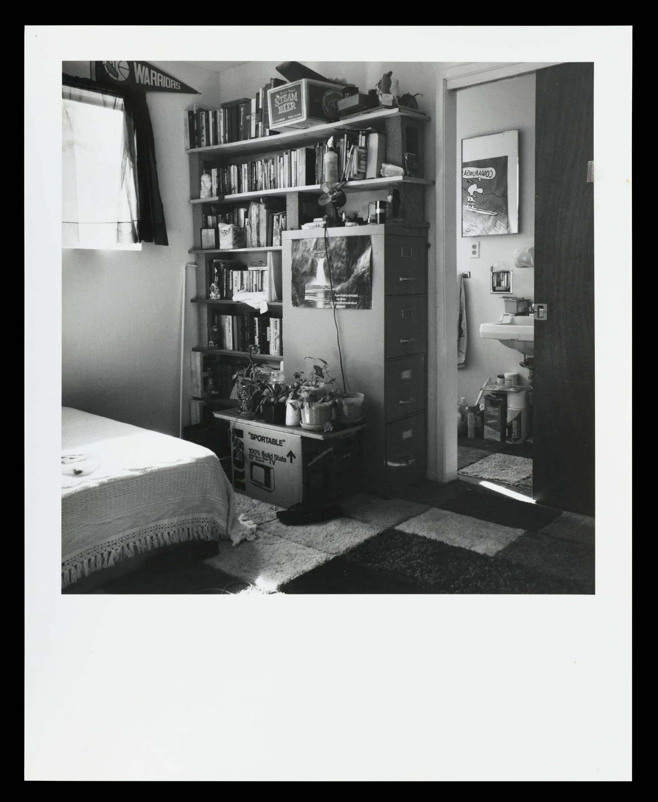 Black and white photograph of a cluttered bedroom interior with a bookshelf, potted plants, a cardboard box, and an open doorway leading to a bathroom