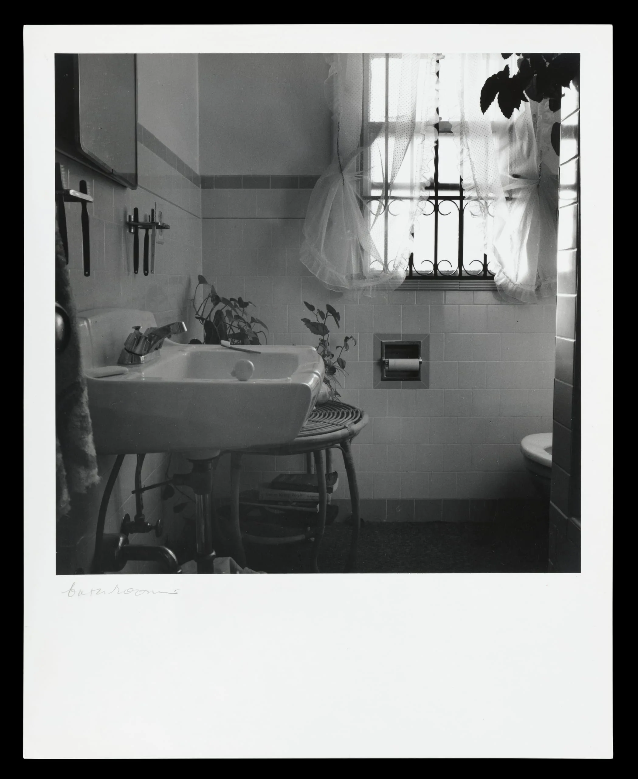Black and white photograph of a small tiled bathroom interior with a pedestal sink, potted plants, lace-curtained barred window, and soft diffused light