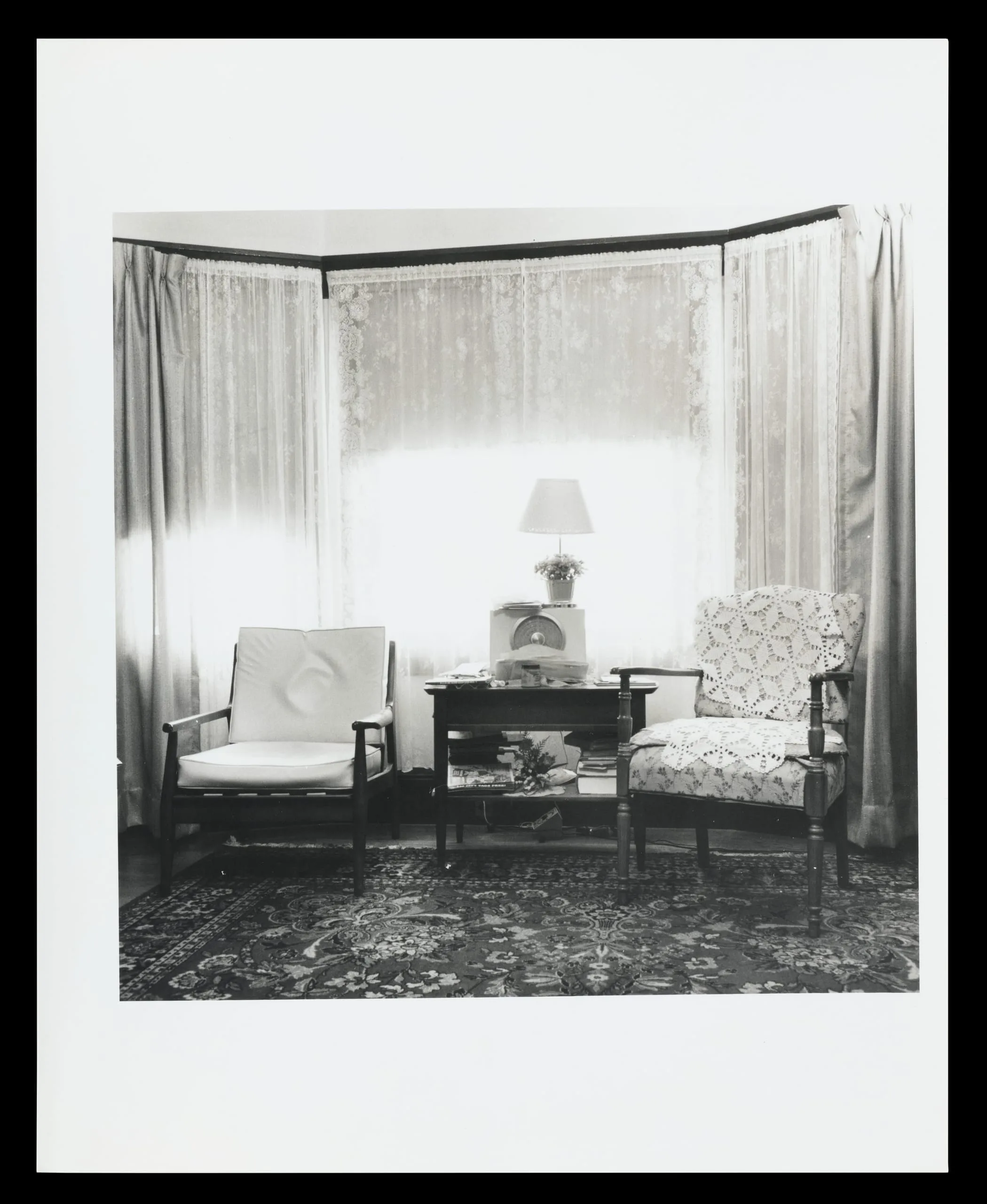 Black and white photograph of a living room corner with two armchairs, a small table with a lamp and record player, and a bright bay window with lace curtains