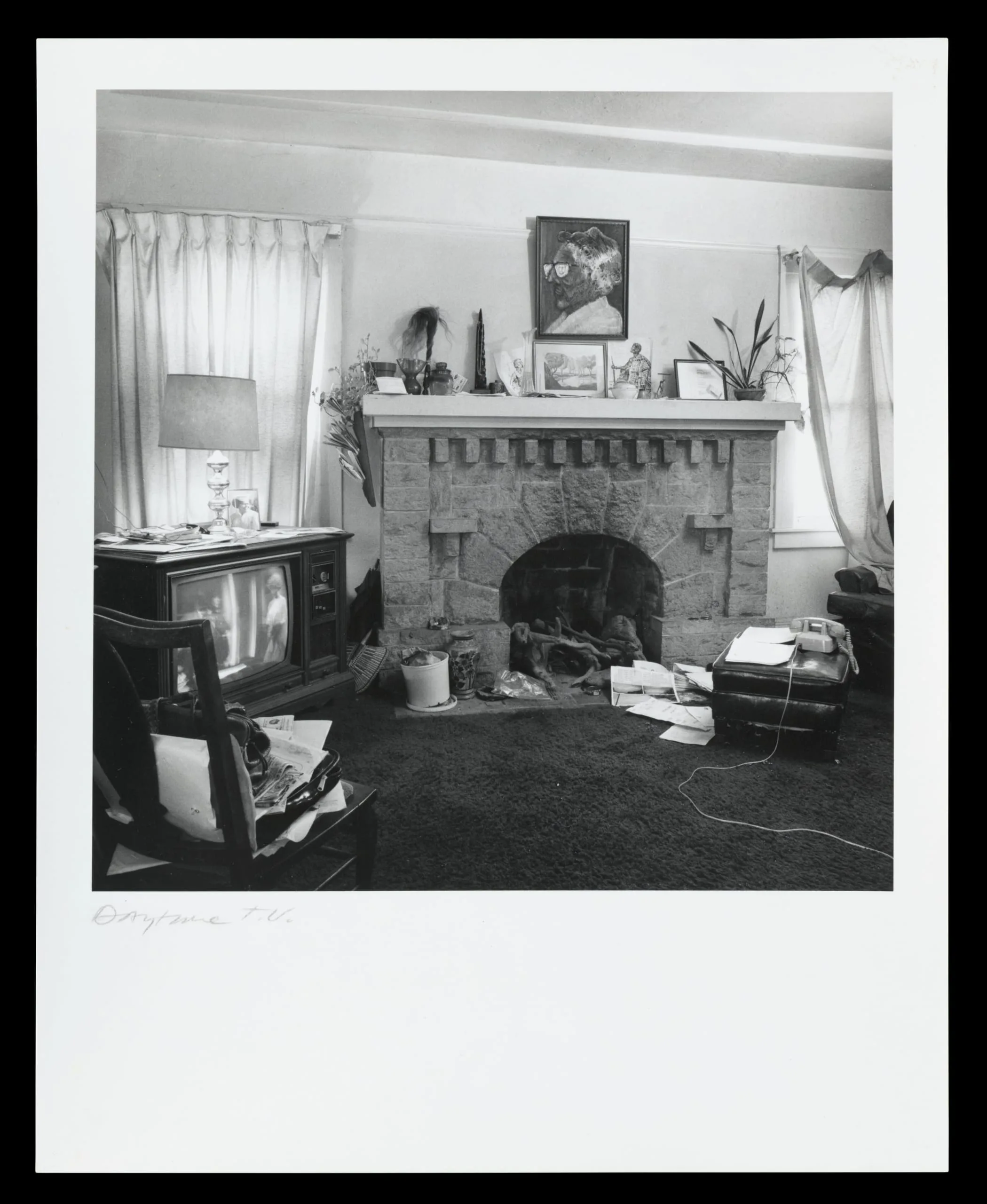 Black and white photograph of a living room interior with a rough stone fireplace, cluttered mantelpiece, boxy console television, and dark carpet