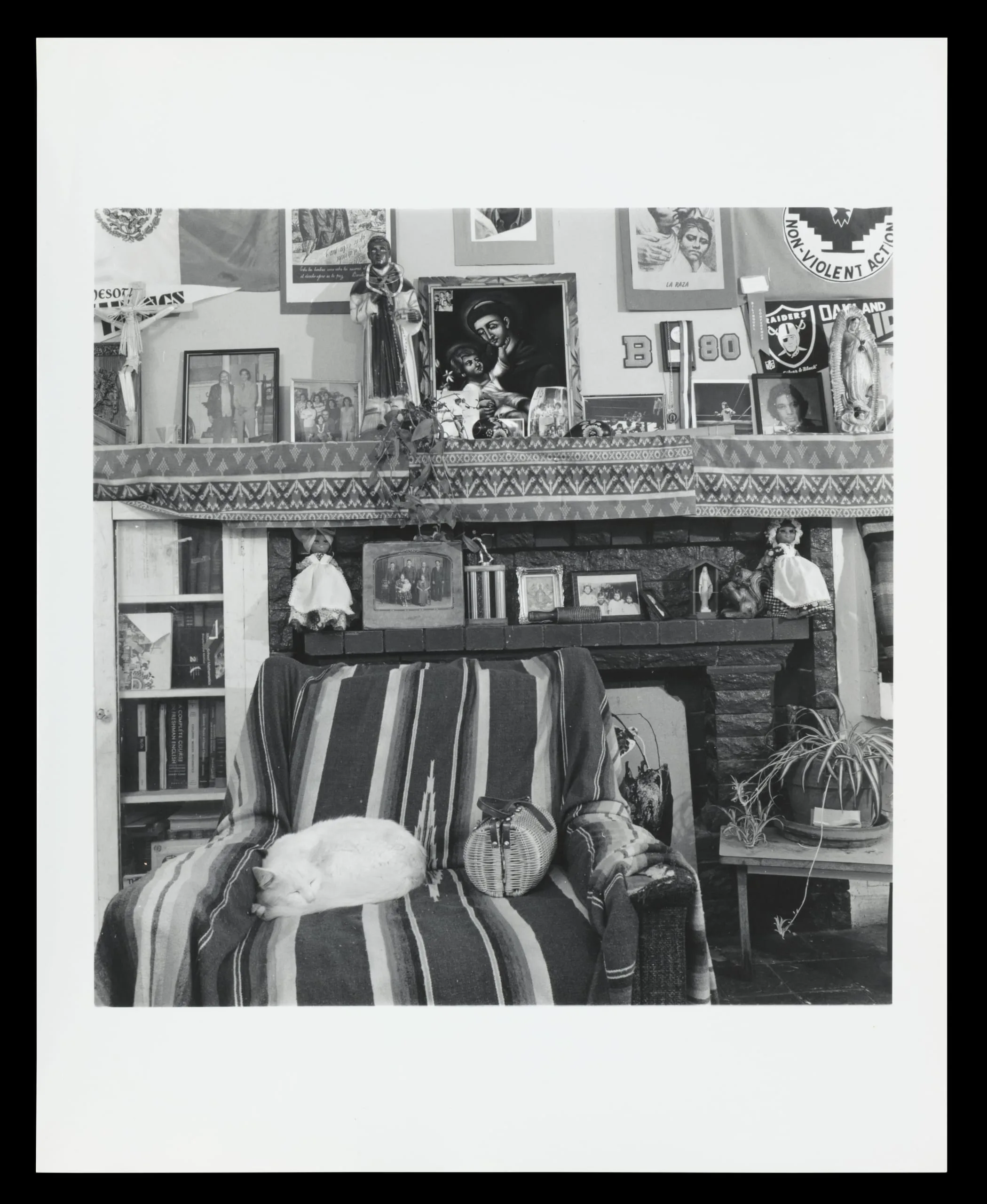 Black and white photograph of a densely decorated living room interior with a striped-draped armchair, fireplace, and wall covered in framed photos, posters, and pennants