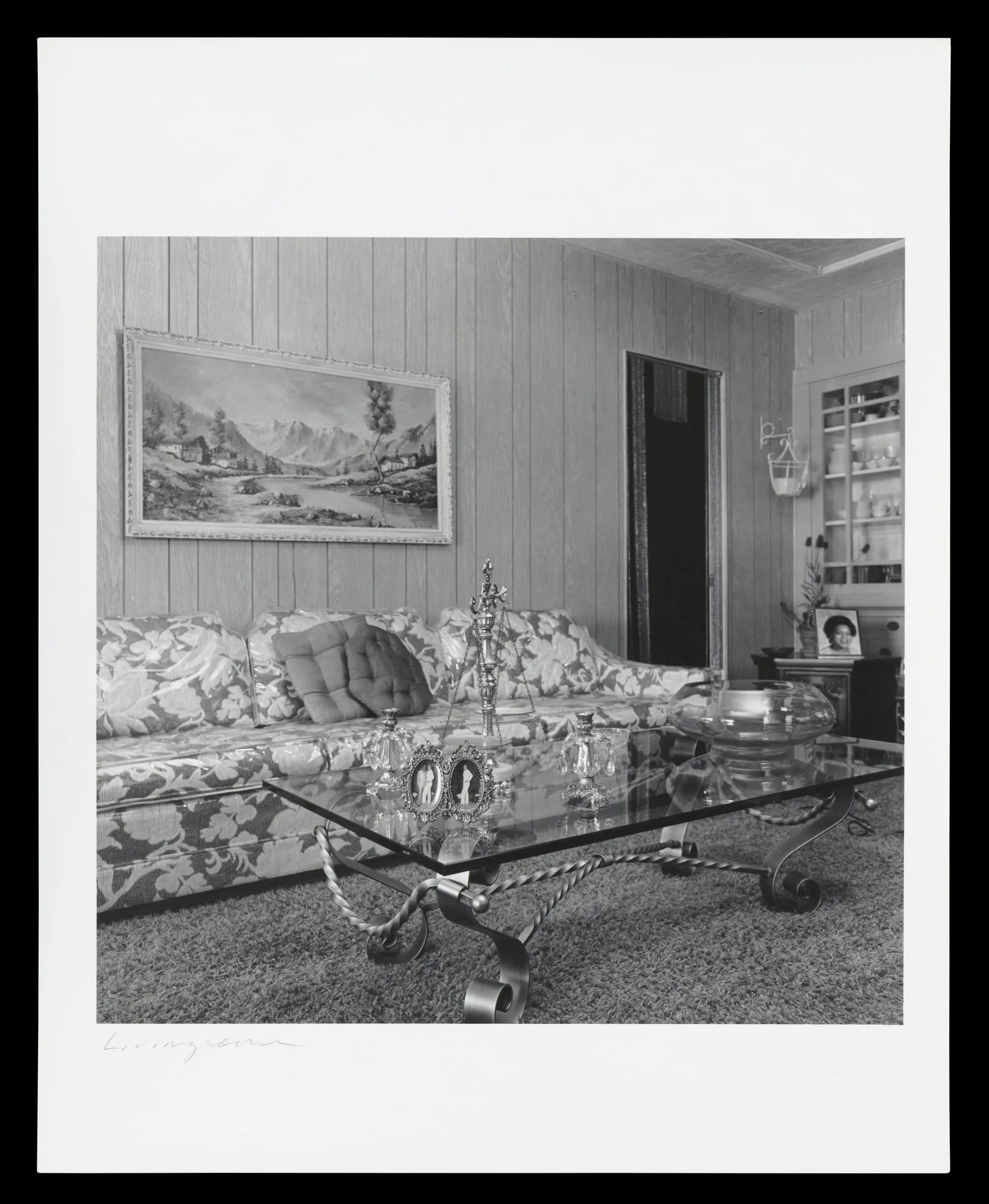 Black and white photograph of a furnished living room interior with a floral sofa, glass-topped wrought-iron coffee table, and a landscape painting on wood-paneled walls
