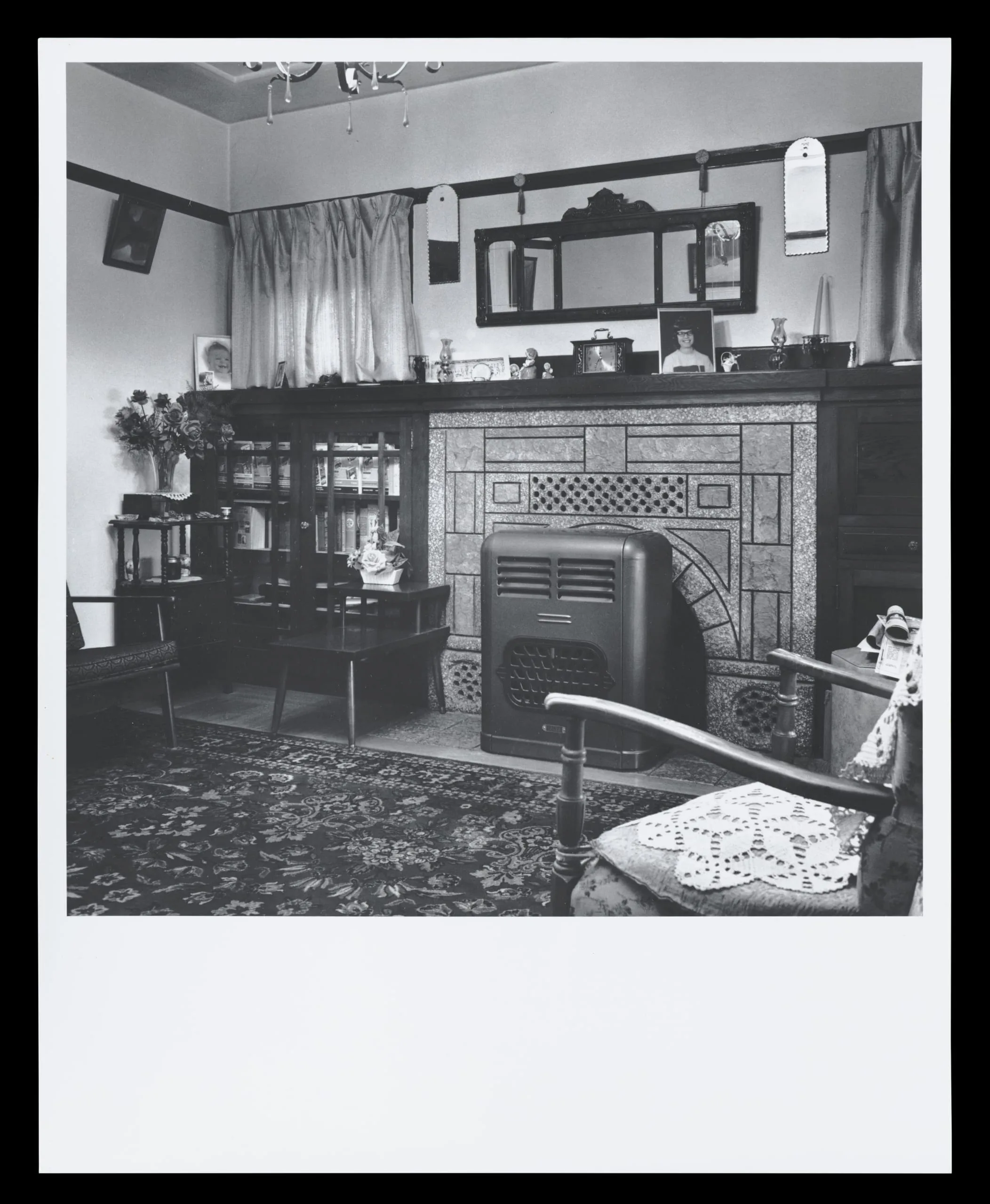 Black and white photograph of a mid-20th century living room interior with a tiled fireplace, freestanding heater, mantel with framed photos, and patterned area rug