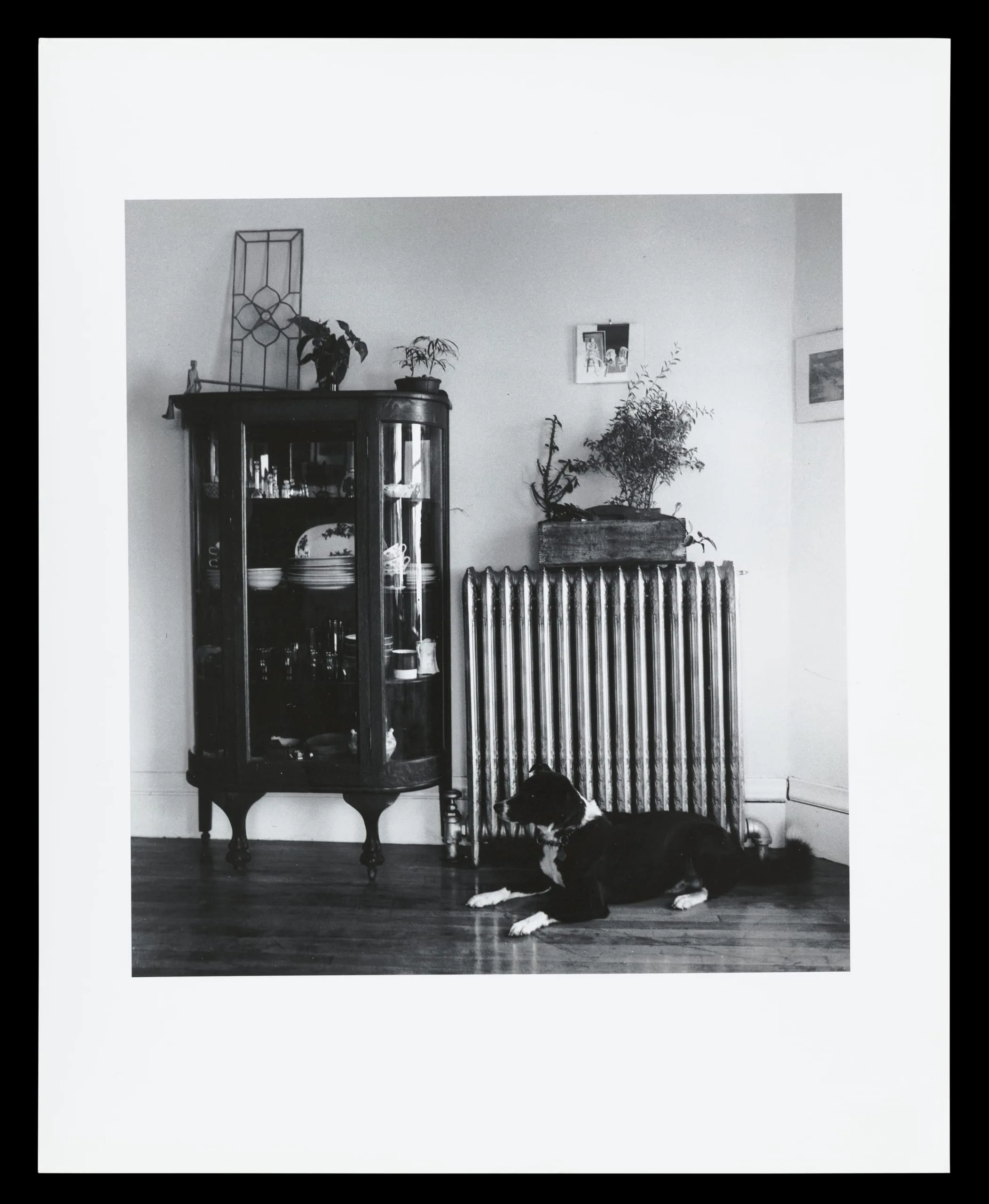Black and white photograph of a home interior with a curved-glass china cabinet, a cast-iron radiator with a plant on top, and a black and white dog resting on a hardwood floor