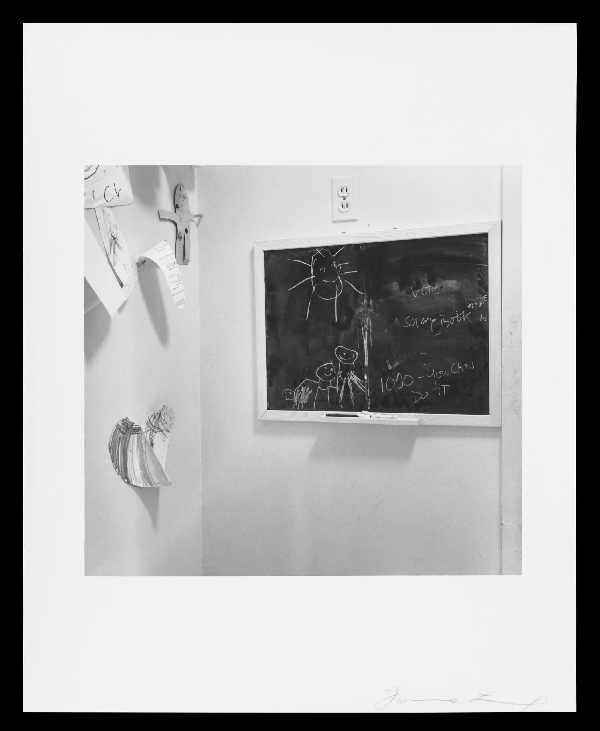 Black and white photograph of a room corner with a dark chalkboard covered in children's chalk drawings and handwritten text, alongside papers and a small wooden cross pinned to the adjacent wall