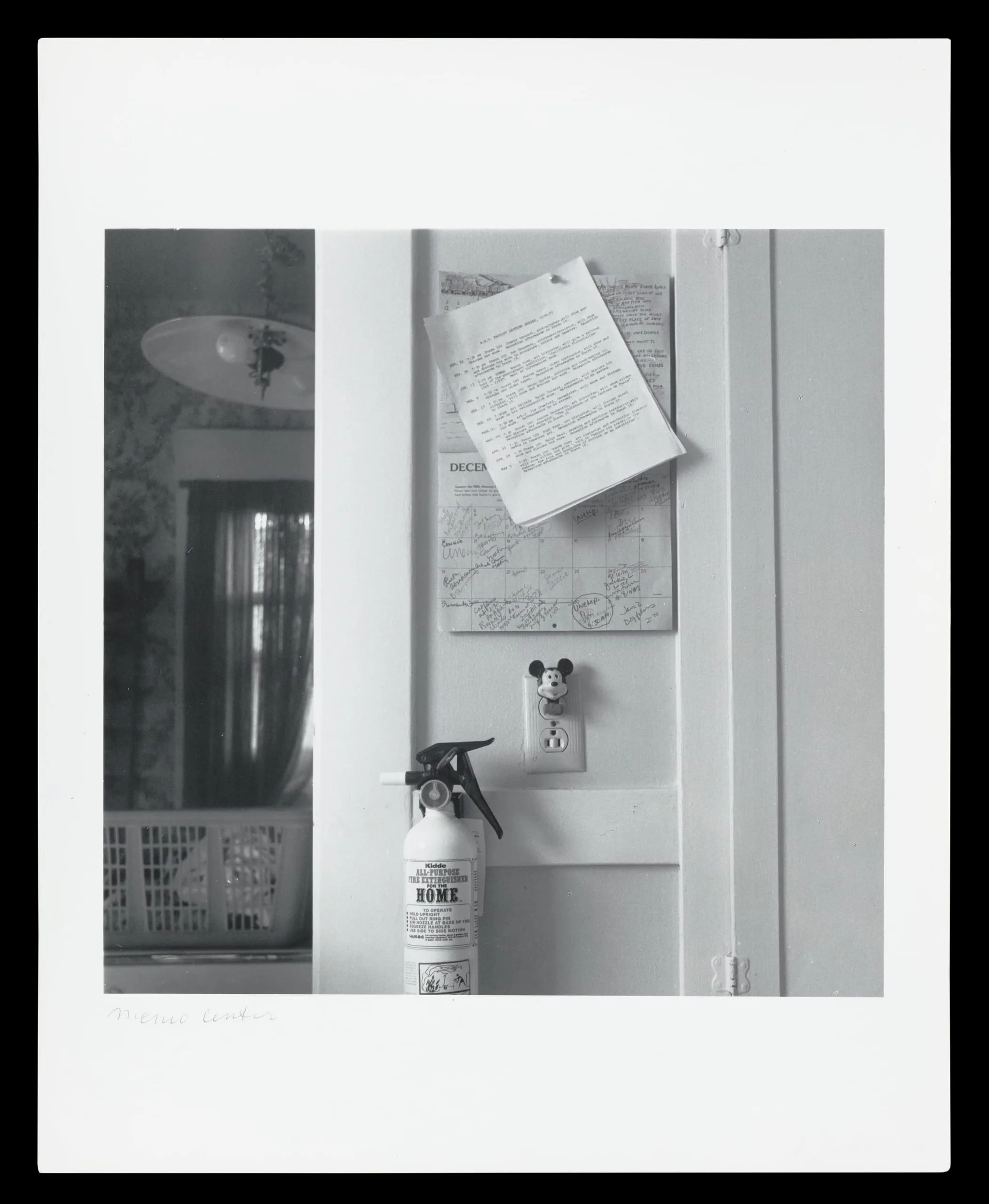 Black and white photograph of a household wall corner with a December calendar, a typed document, a Mickey Mouse outlet cover, and a fire extinguisher labeled HOME