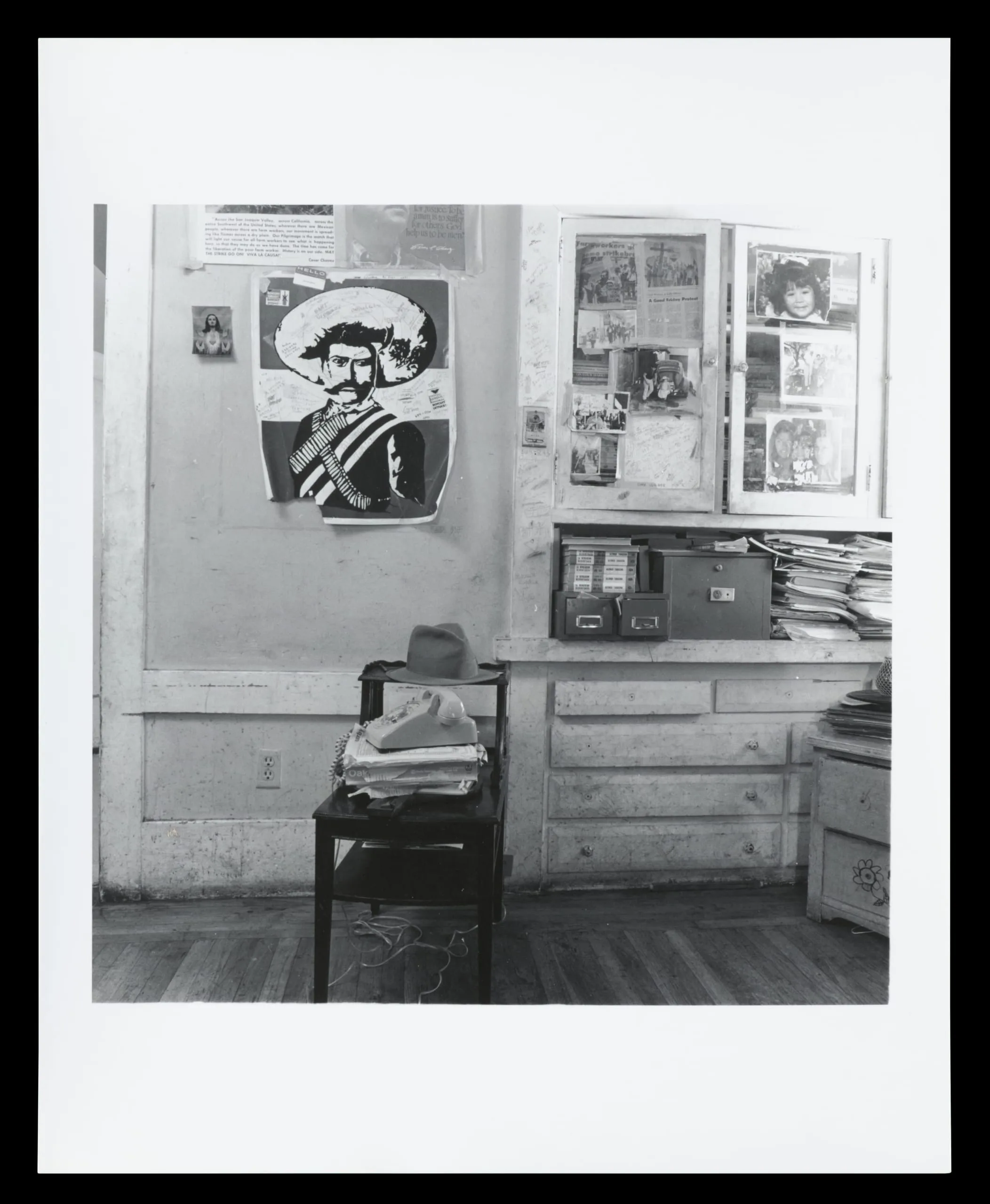 Black and white photograph of a cluttered office corner with a bold portrait poster, bulletin board, file boxes, and a chair holding papers and a hat