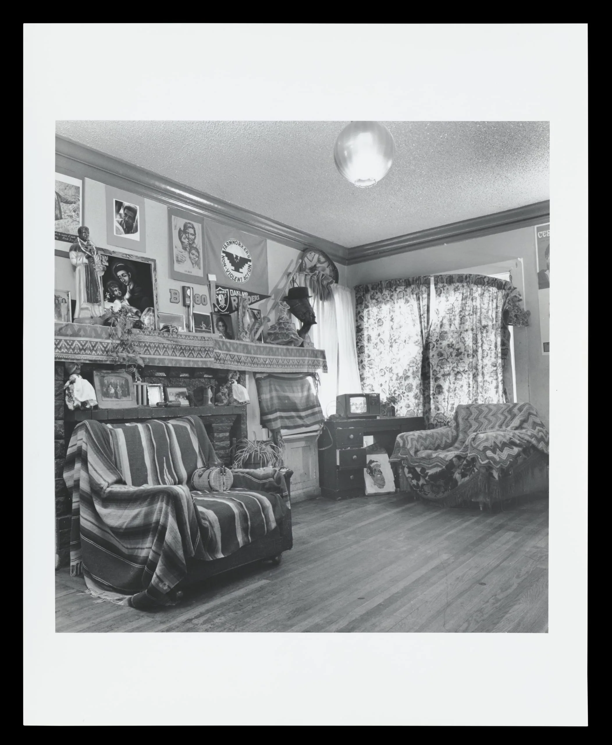 Black and white photograph of a furnished living room interior with draped armchairs, a crowded mantel, family photographs on the walls, and floral curtains over a window