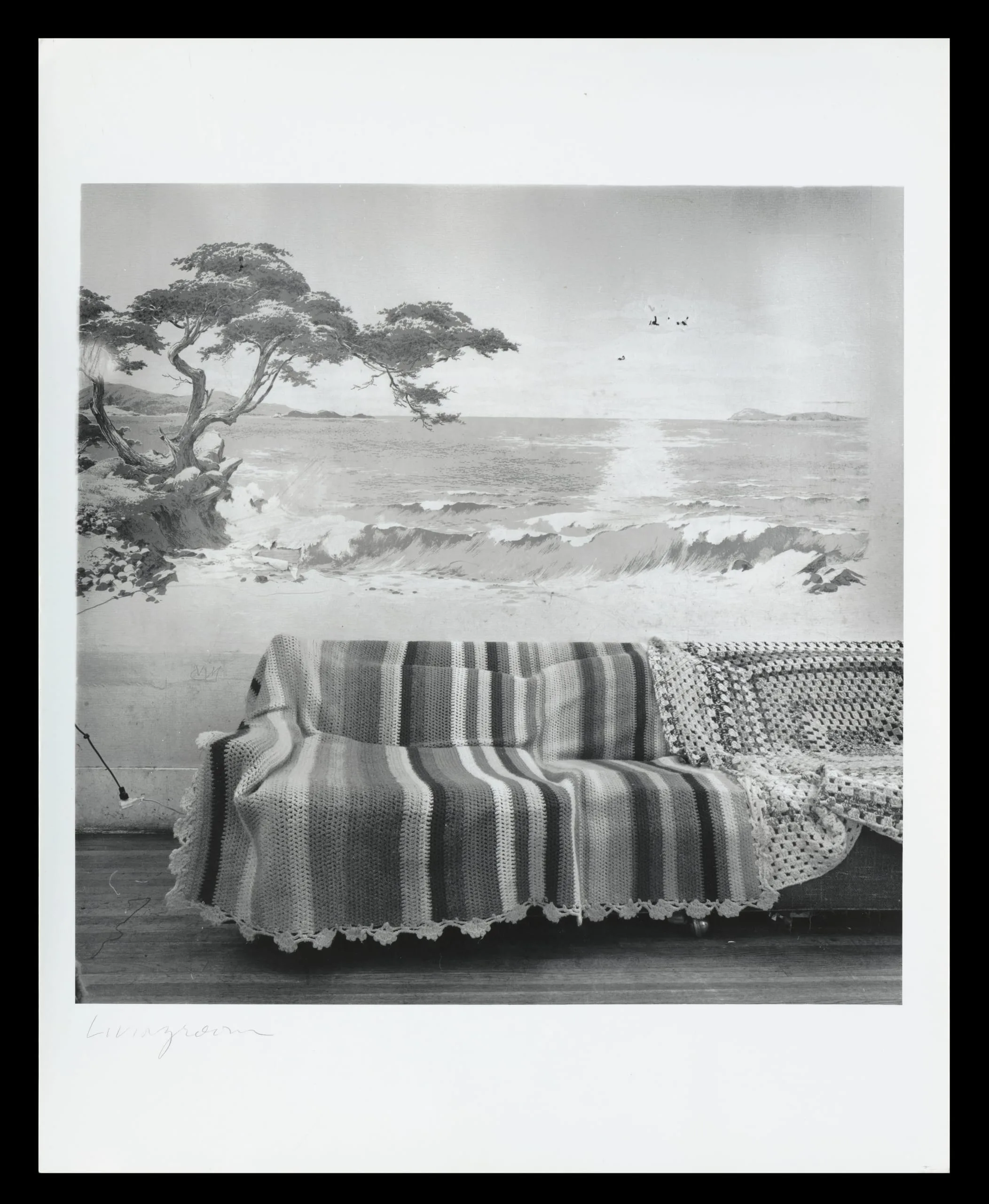 Black and white photograph of a sofa covered in crocheted blankets positioned against an interior wall painted with a coastal seascape mural