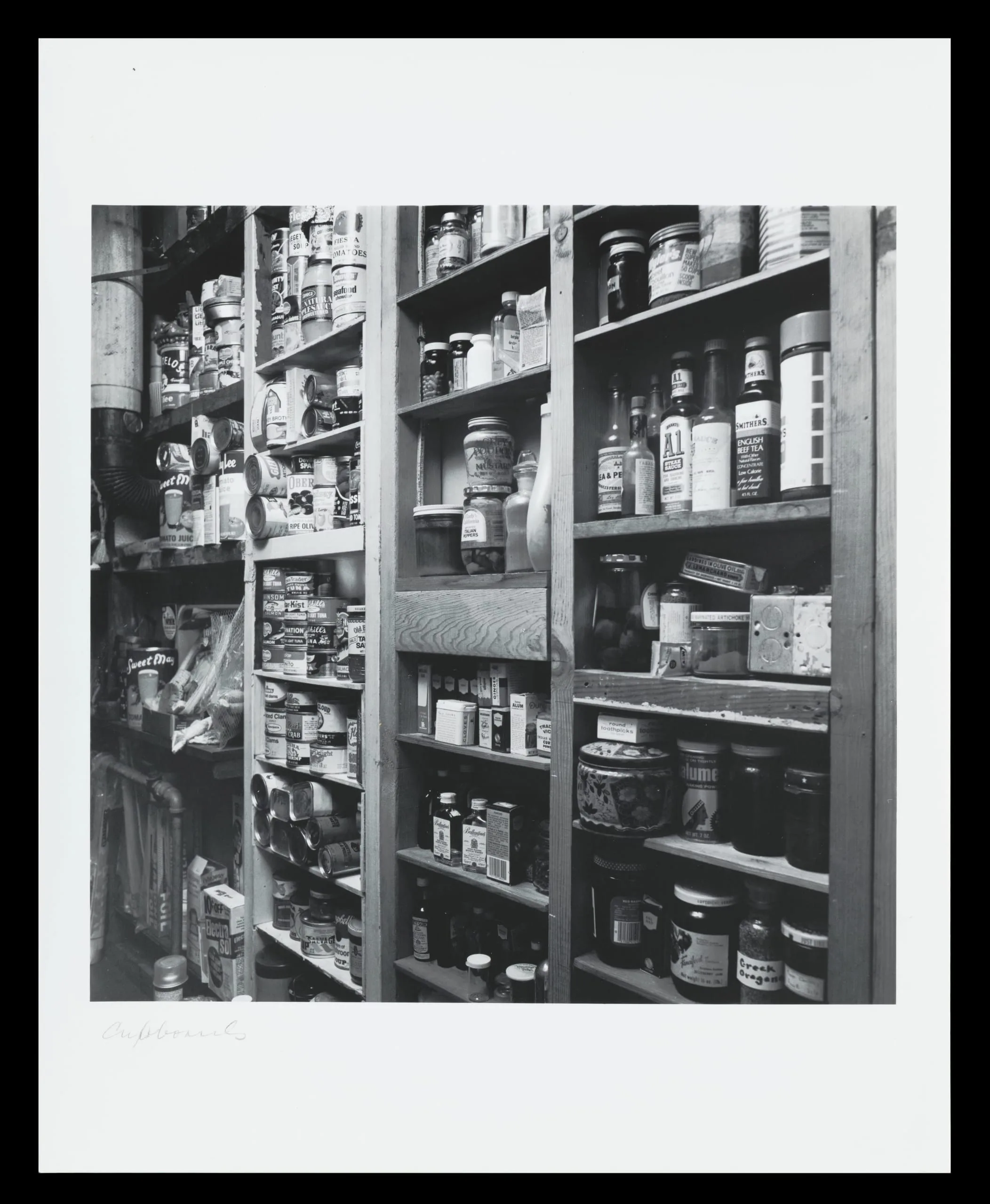 Black and white photograph of two wooden pantry shelves packed with canned goods, bottles, jars, and packaged foods