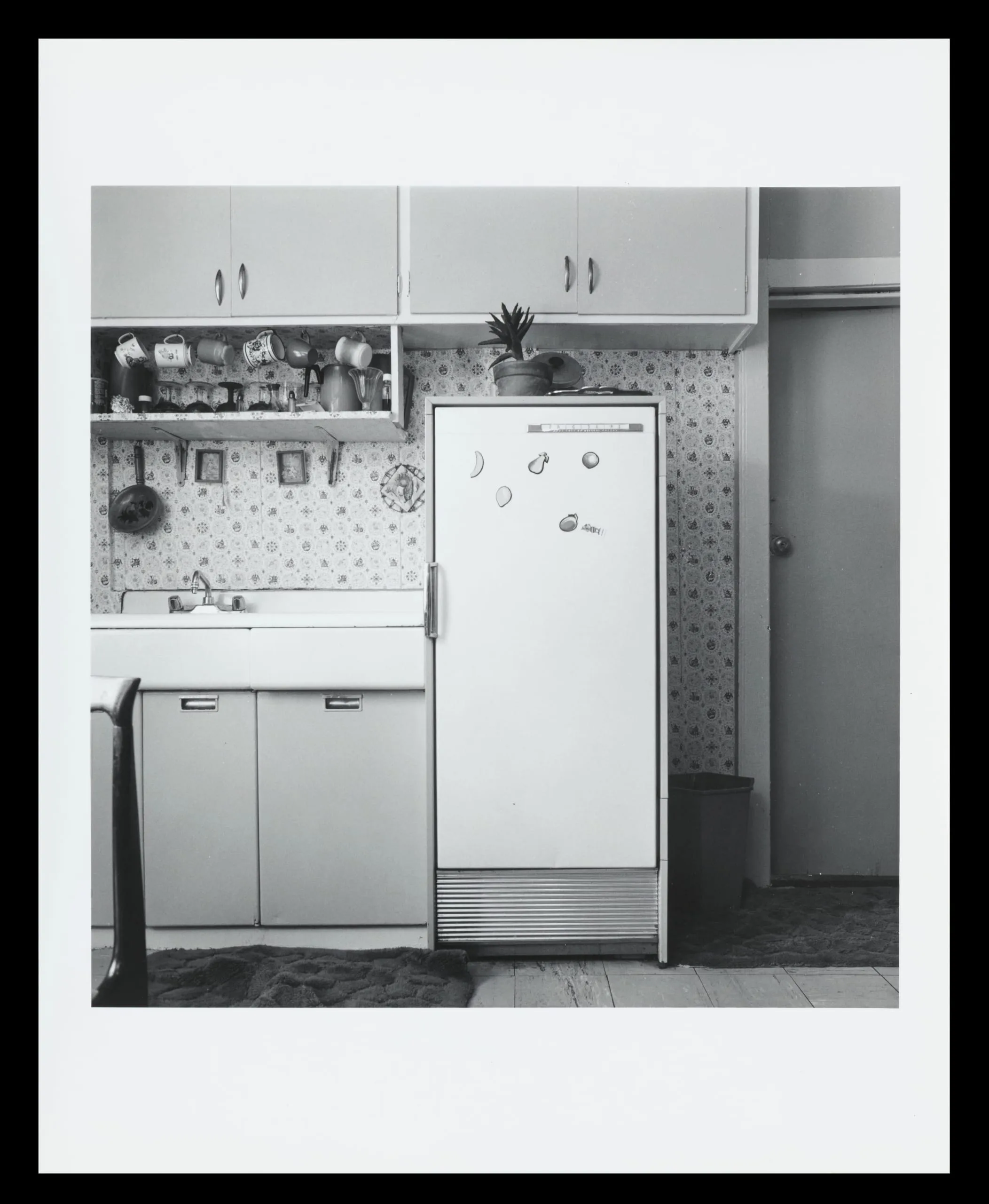 Black and white photograph of a small kitchen corner with a tall refrigerator, patterned wallpaper, open shelving with mugs, and a sink with lower cabinets