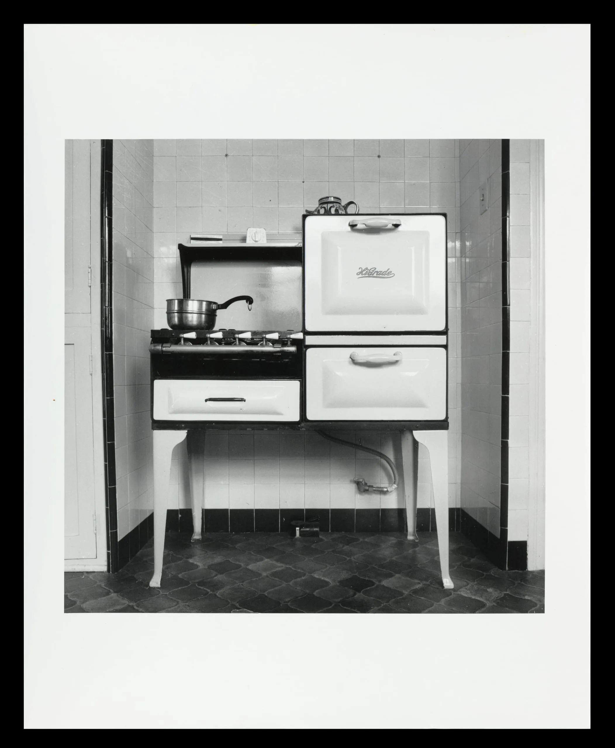 Black and white photograph of a vintage white enamel gas stove with black trim, set in a white-tiled kitchen alcove with a saucepan on the burners