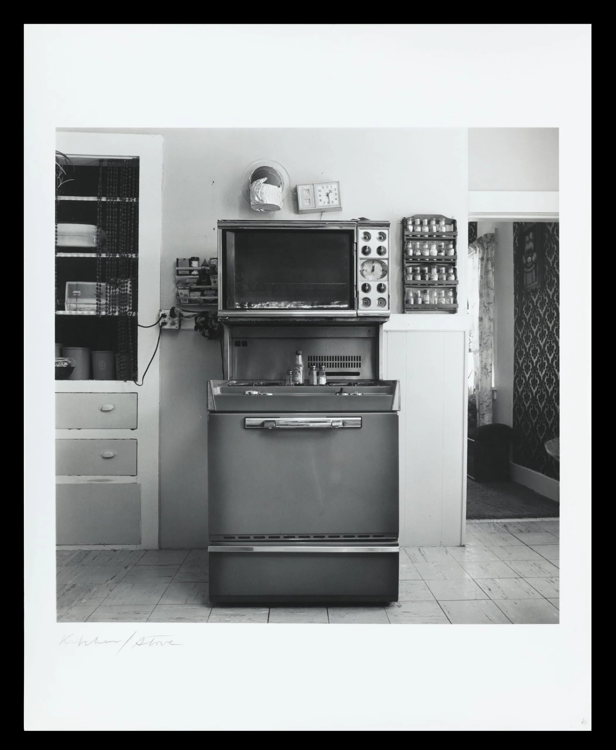 Black and white photograph of a kitchen interior centered on a freestanding stove with a toaster oven stacked on top, flanked by drawers and shelving
