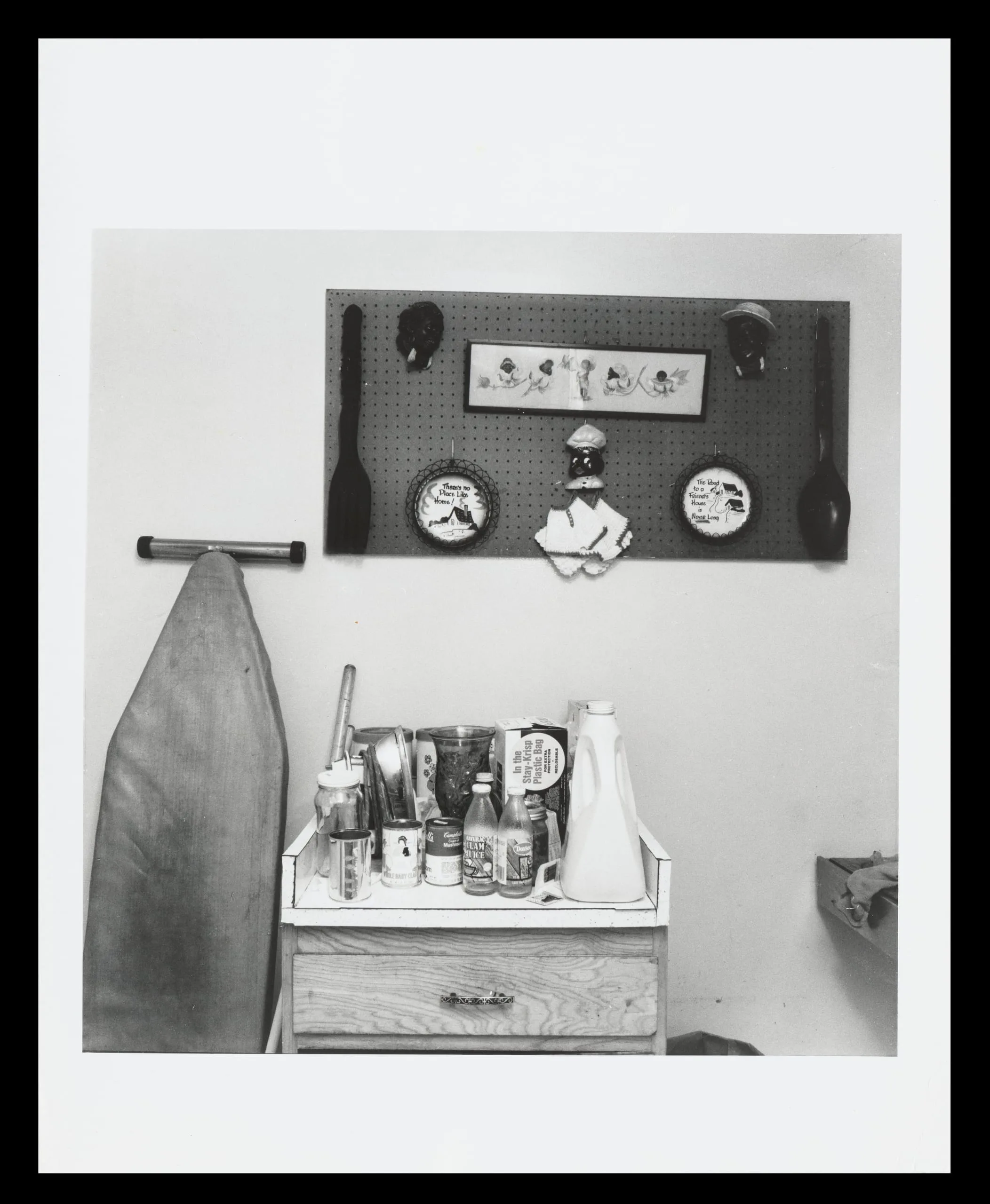 Black and white photograph of a room corner with a pegboard mounted on the wall holding decorative plates and figurines, a cluttered wooden utility cart below, and an ironing board leaning to the left