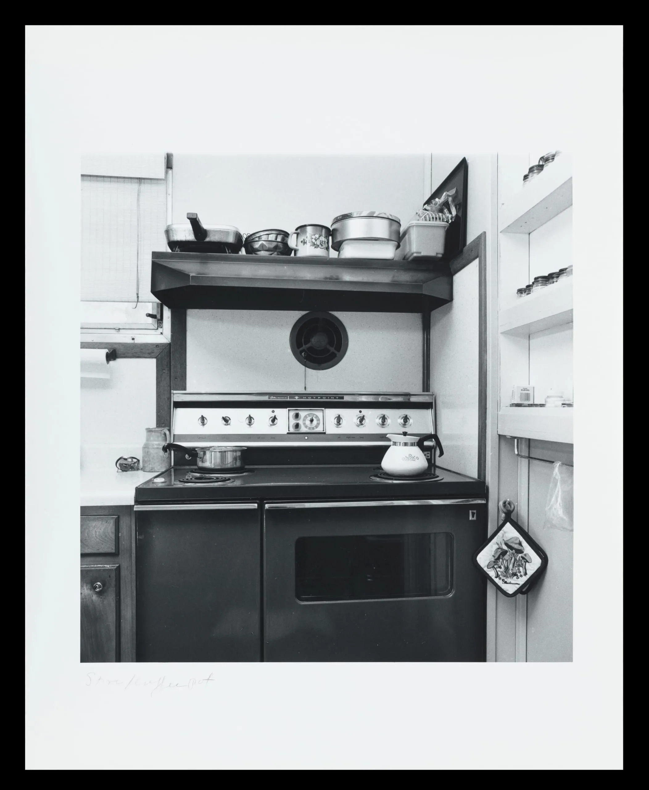 Black and white photograph of a freestanding electric kitchen stove with an overhead shelf loaded with pots and pans, flanked by wood cabinets and open shelving