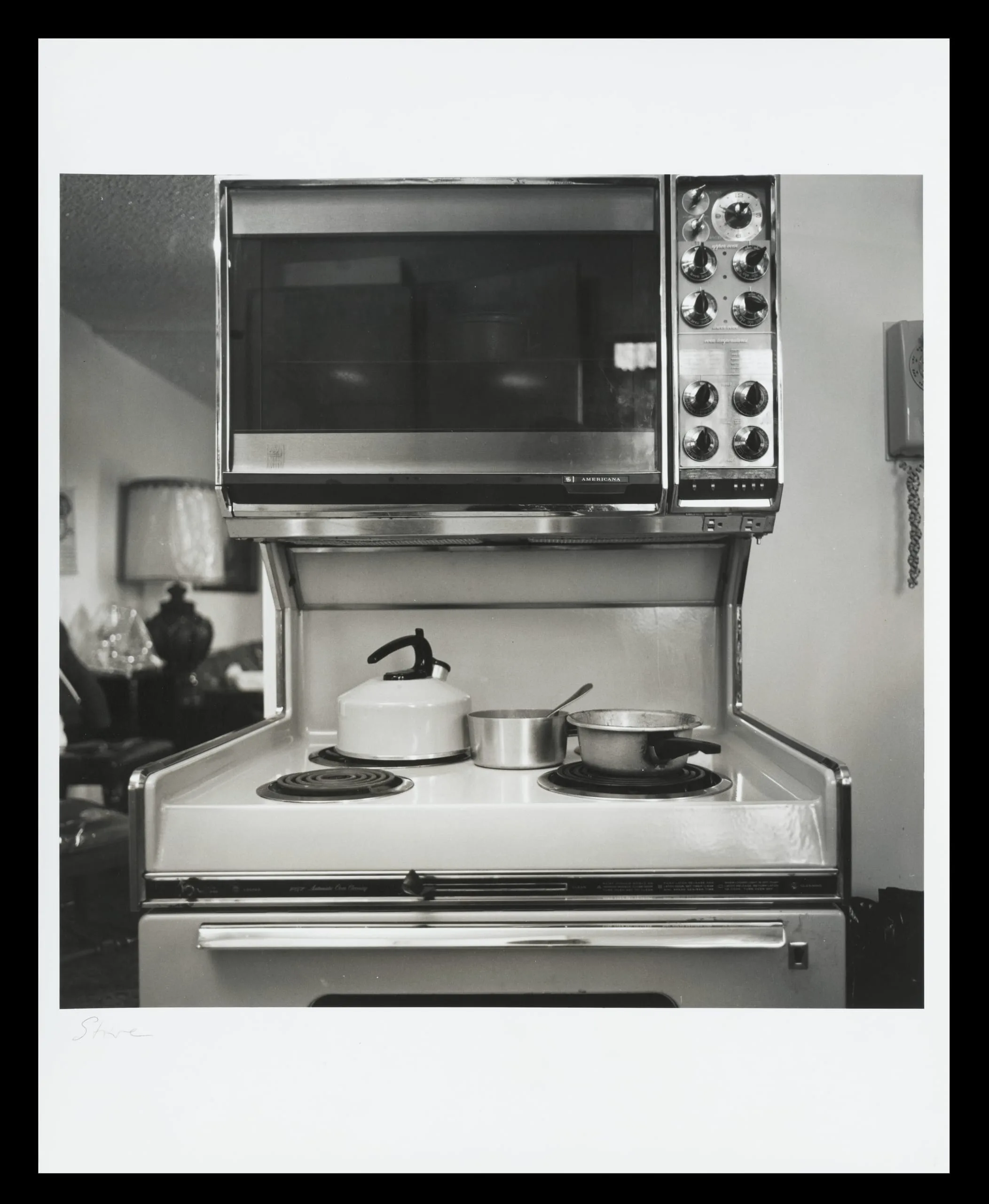 Black and white photograph of a compact kitchen with a two-burner electric stovetop, a kettle and saucepan on the burners, and a large chrome microwave mounted above