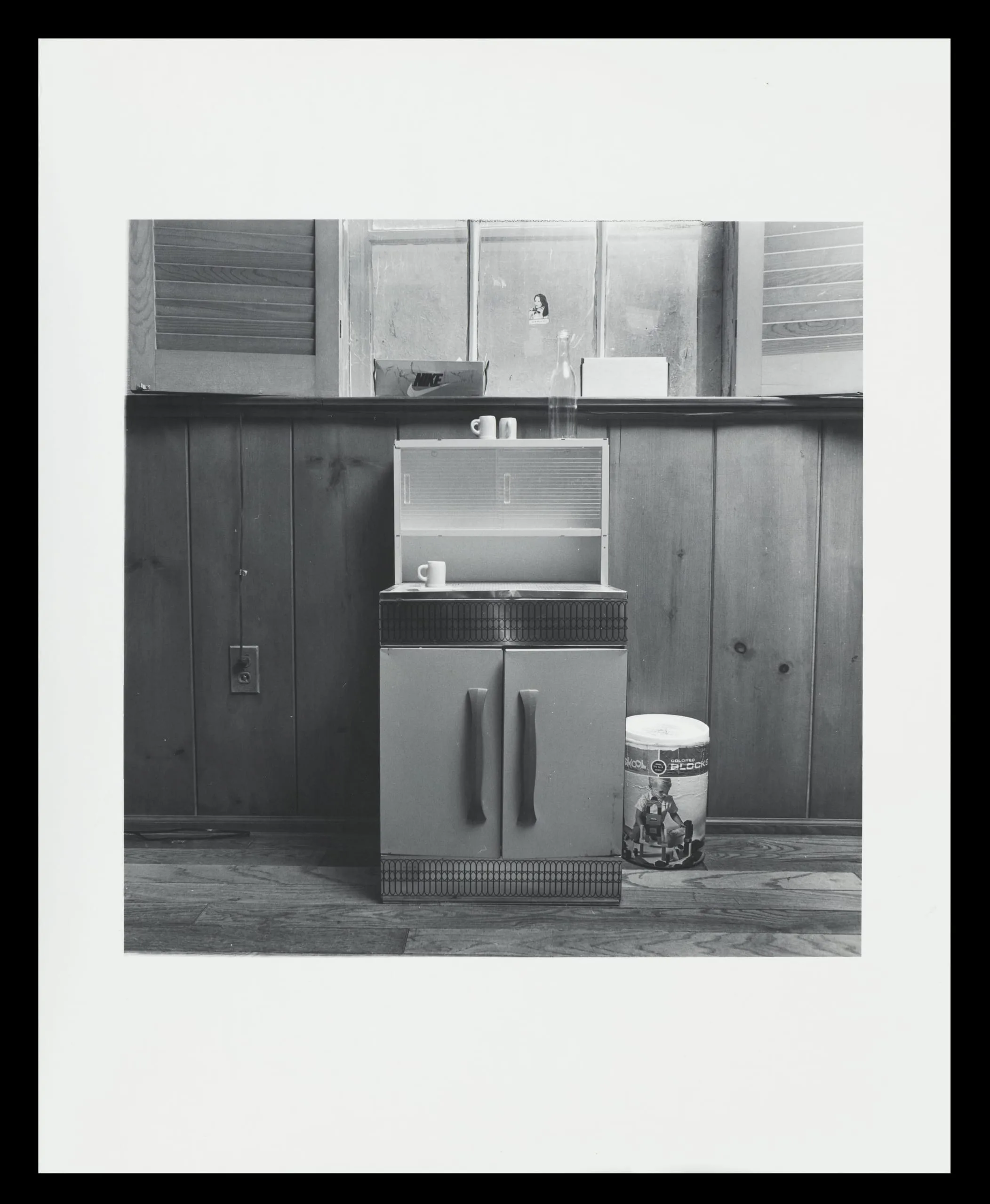 Black and white photograph of a small cabinet with an illuminated hutch shelf against a wood-paneled wall, with a large printed cylindrical container on the floor to the right