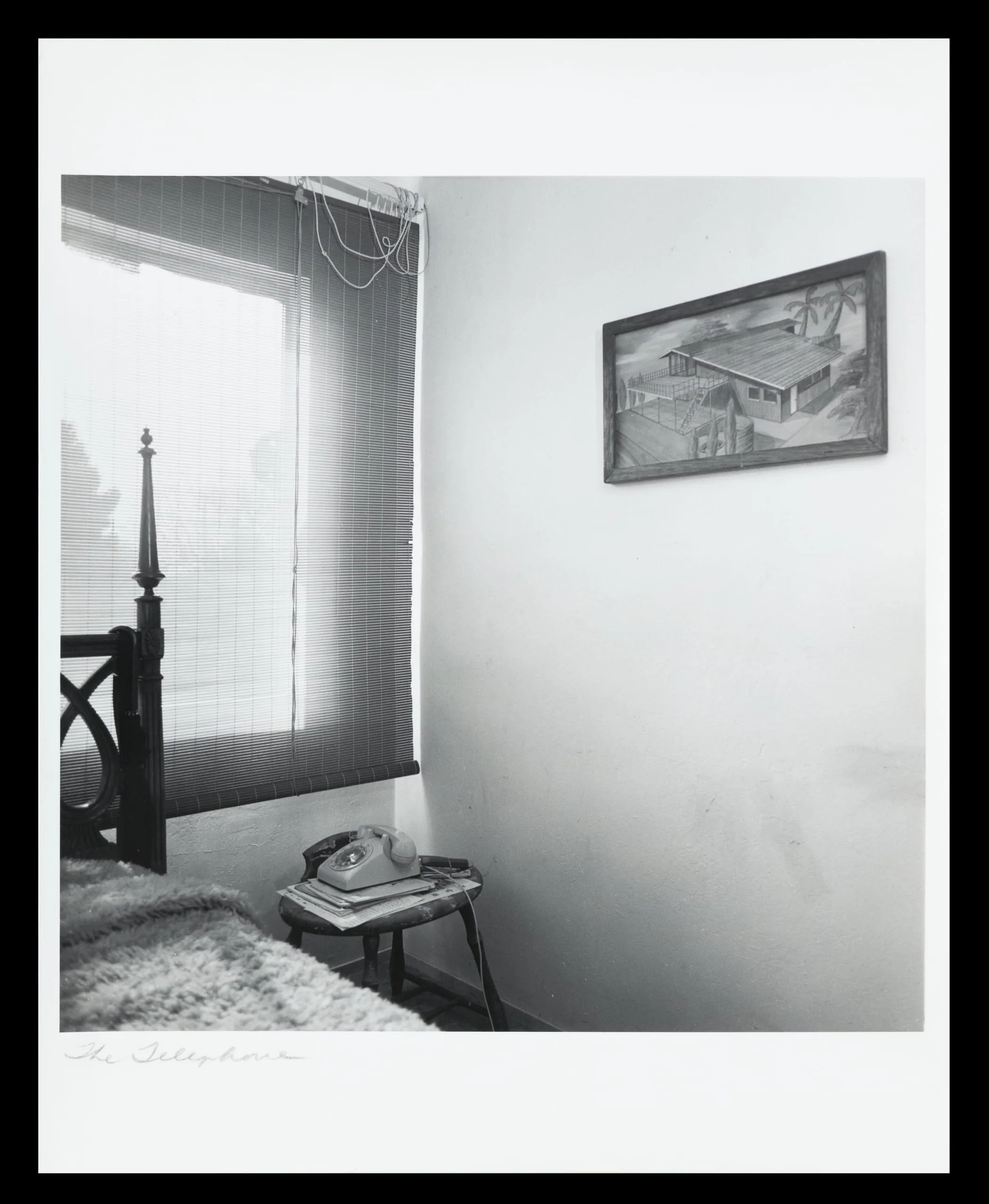 Black and white photograph of a bedroom corner with a rotary telephone on a stool, venetian-blind window, and a framed architectural drawing on the wall