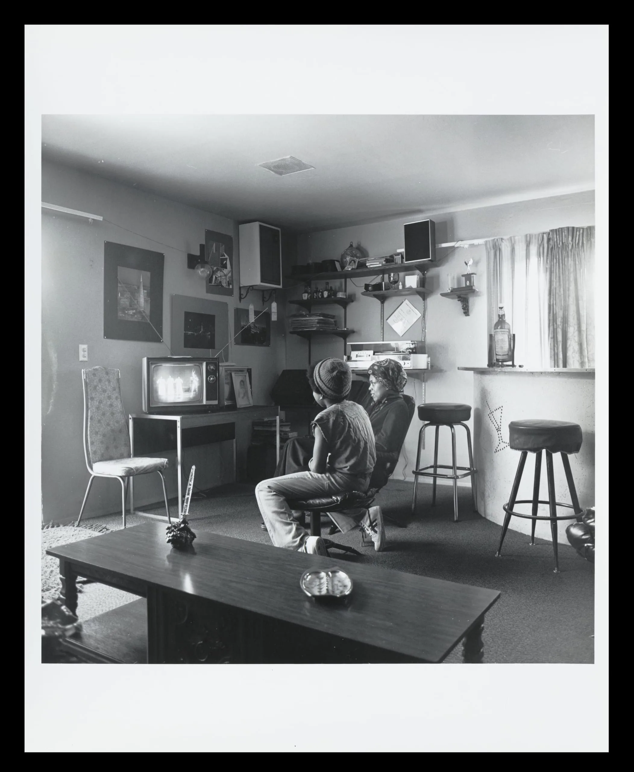 Black and white photograph of two people seated together watching a glowing television in a furnished living room with shelving, bar stools, and a coffee table in the foreground