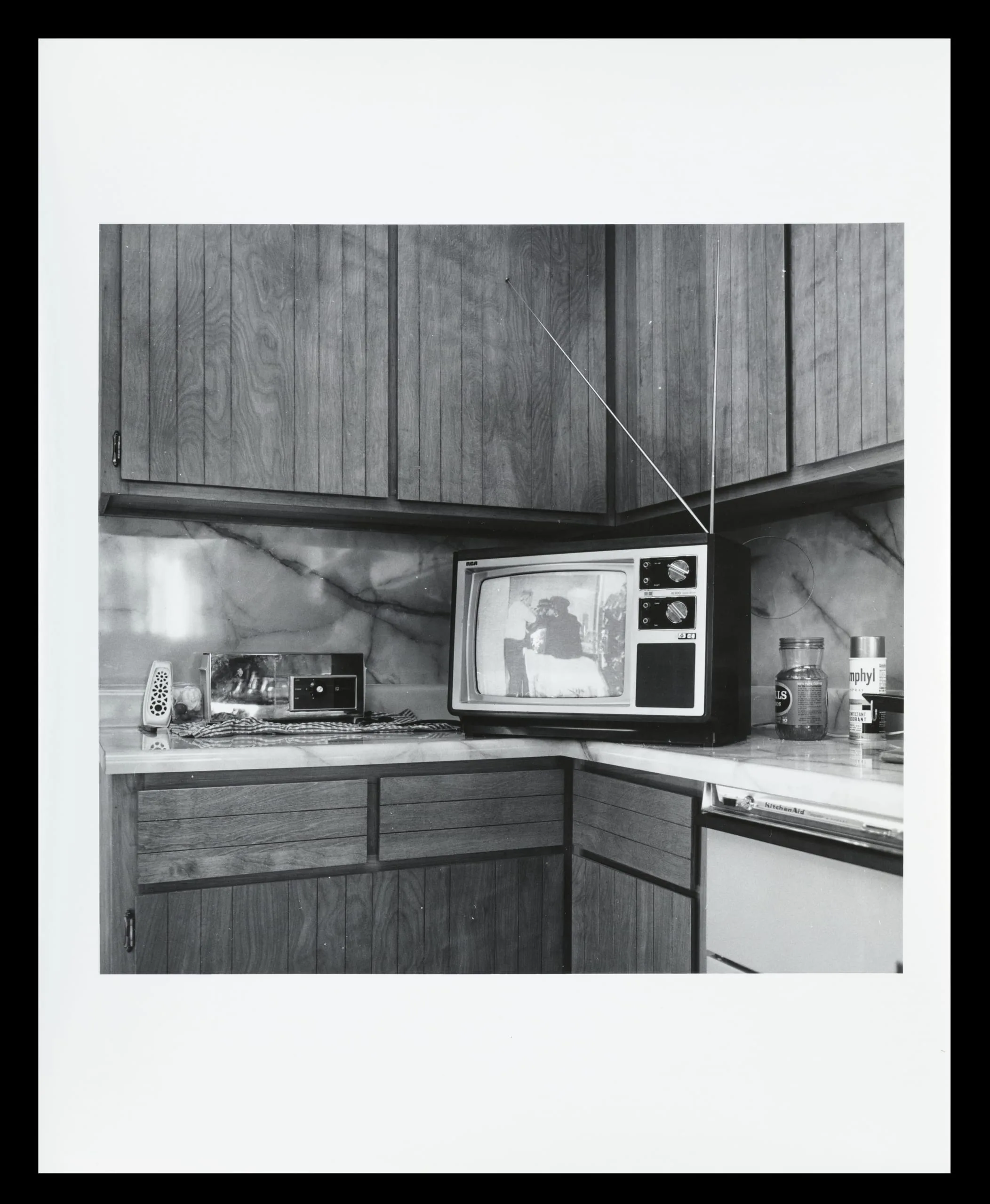 Black and white photograph of a kitchen corner with wood-grain cabinets, a portable television with rabbit-ear antenna on the countertop, and small appliances