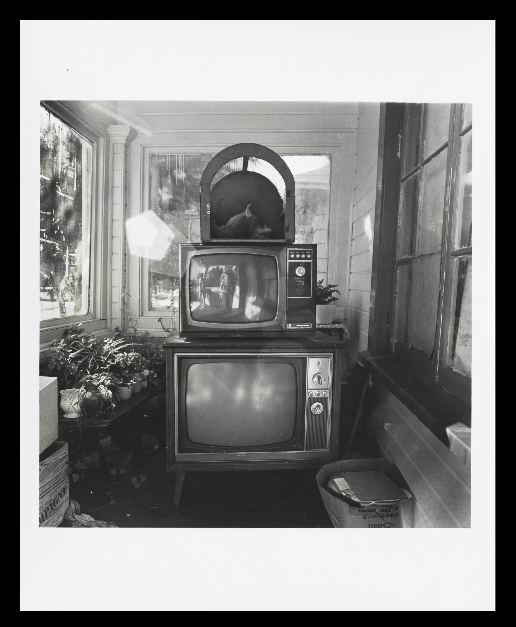 Black and white photograph of two stacked vintage televisions in a cluttered sunporch, one screen showing a faint broadcast, potted plants and windows visible on either side