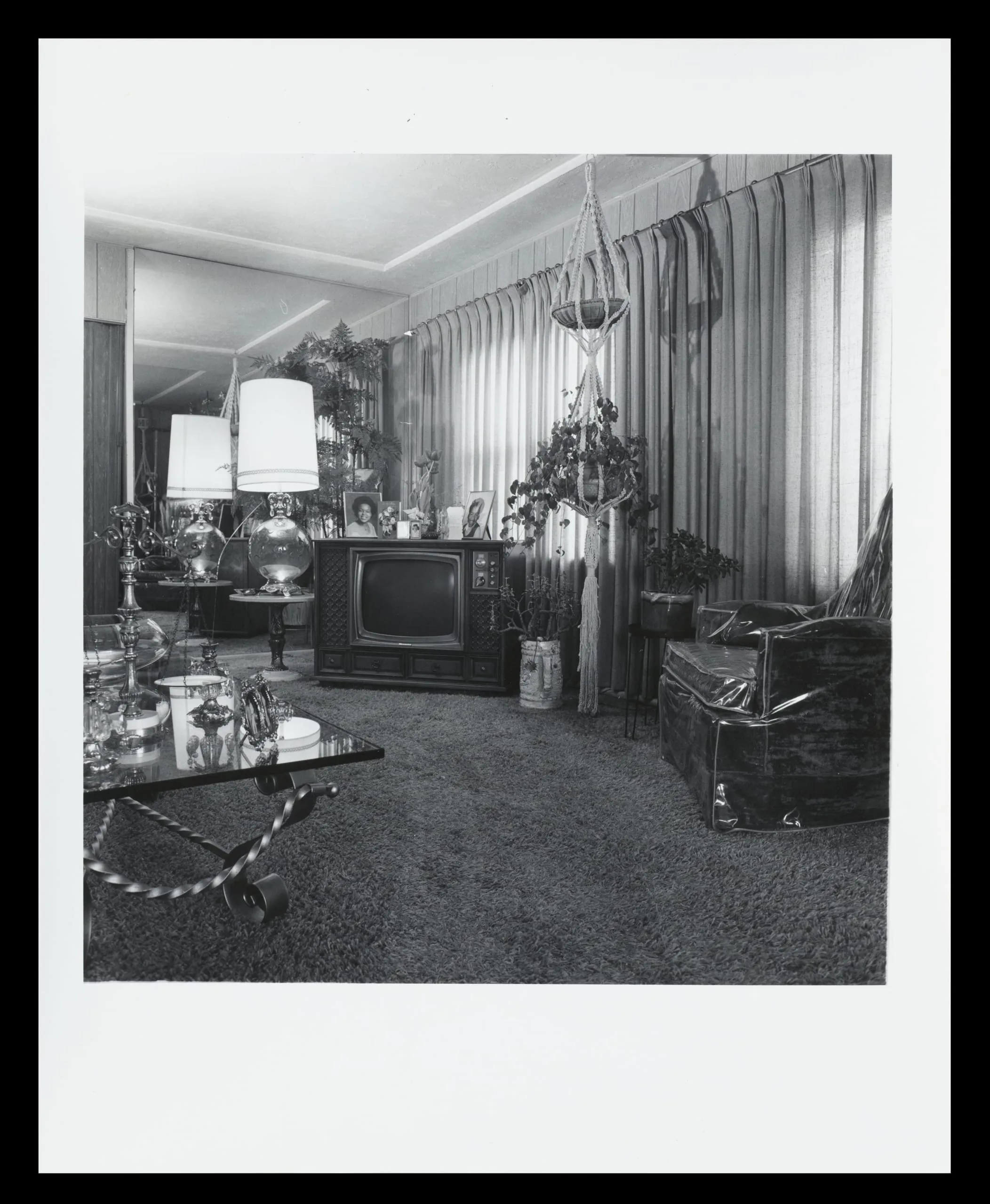 Black and white photograph of a furnished living room interior with shag carpet, a console television, table lamps, hanging macramé planter, and floor-to-ceiling curtains