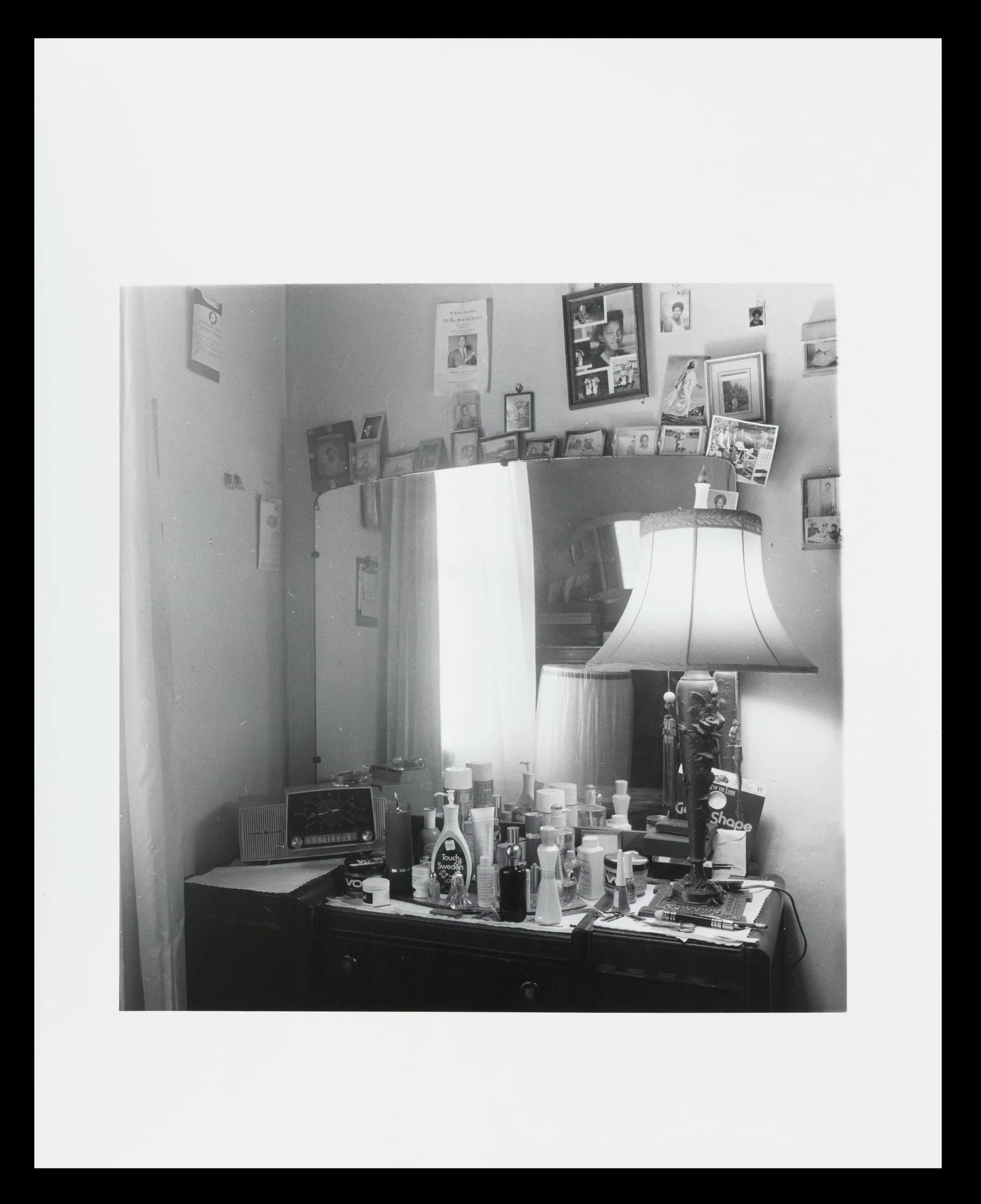 Black and white photograph of a bedroom dresser crowded with personal care products and a lamp, with a mirror lined with framed photos above