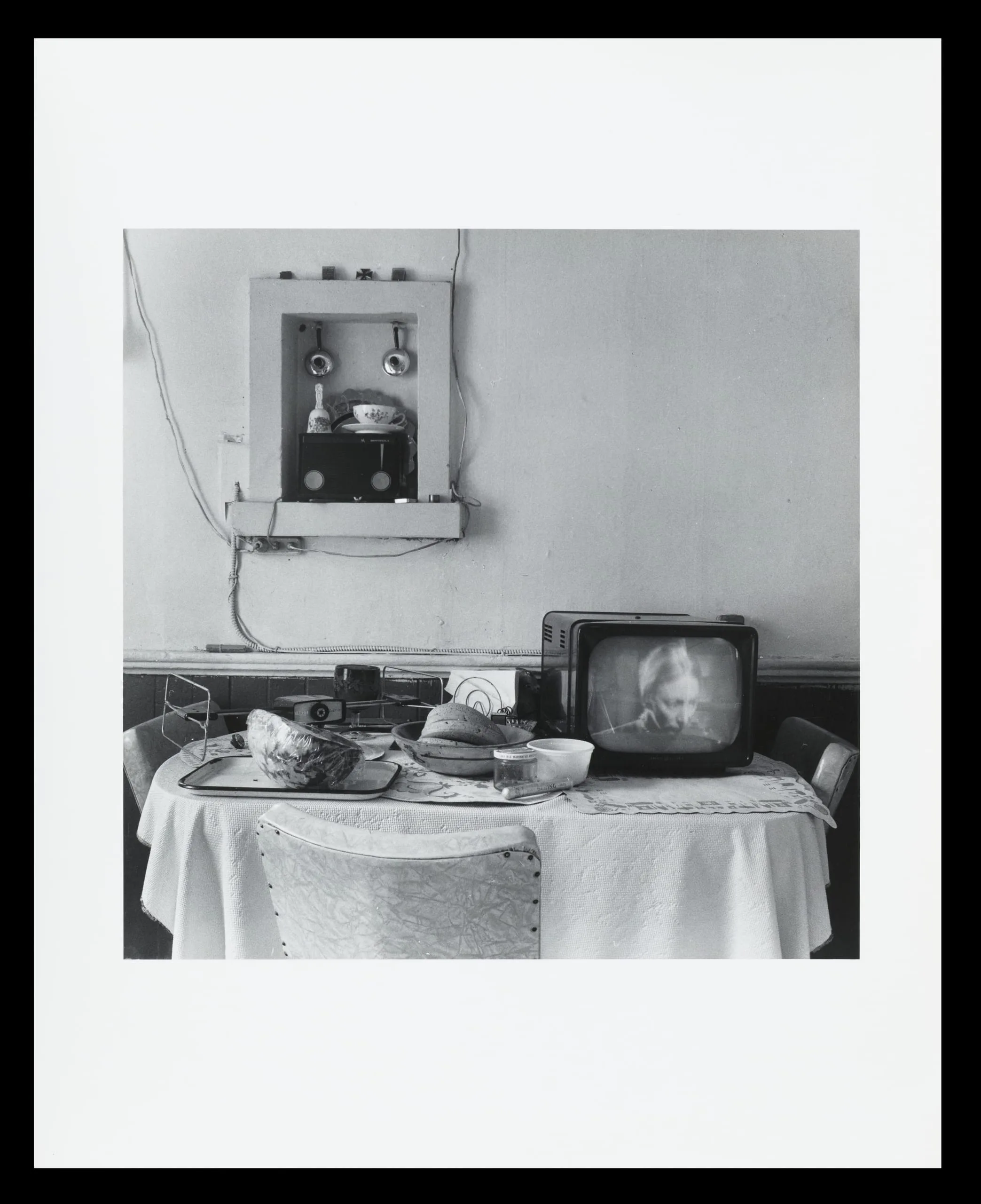 Black and white photograph of a round table set with a lace-edged cloth, food on a tray, and a vintage television displaying a face, with a wall-mounted cabinet above