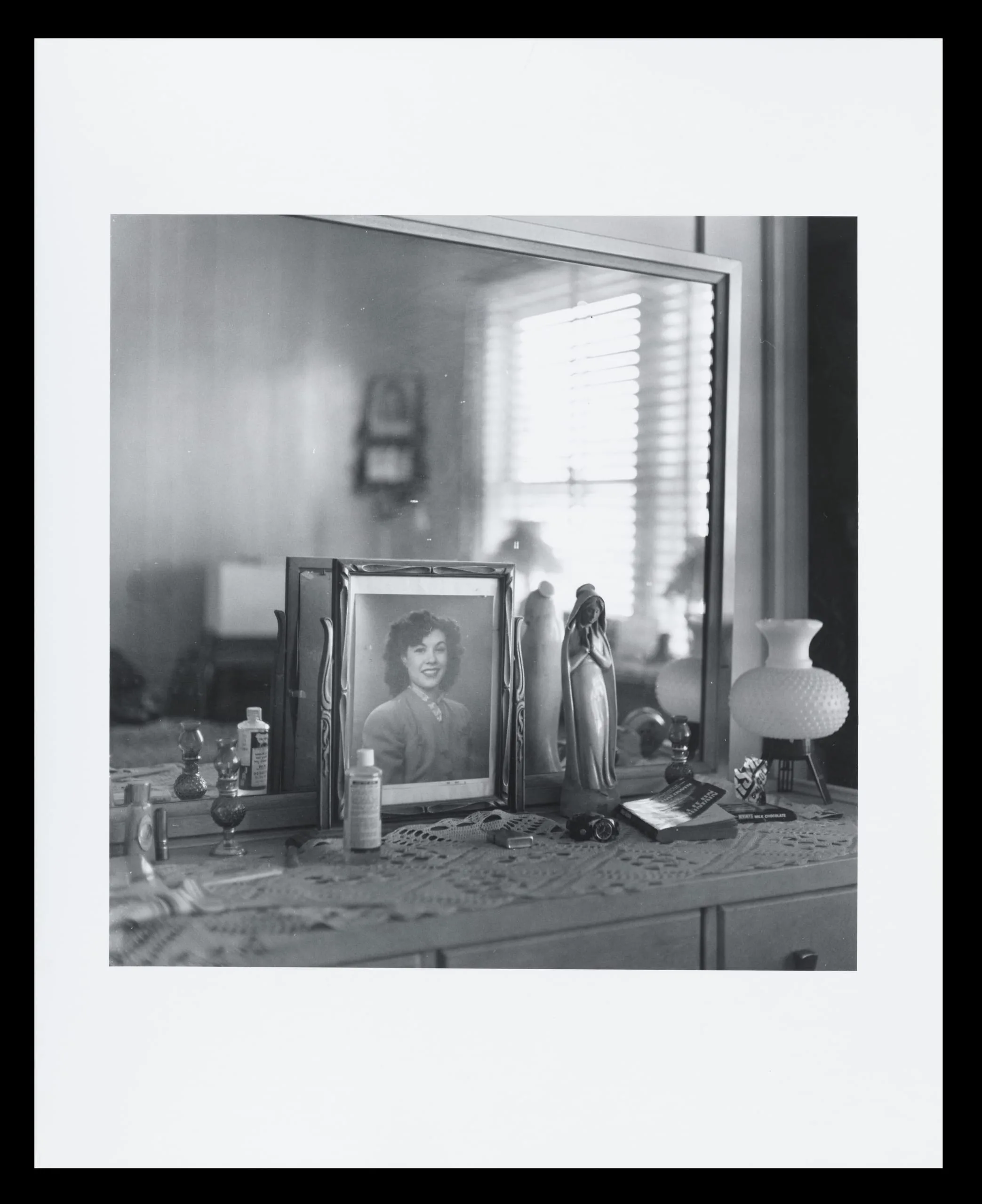 Black and white photograph of a dresser top with a framed portrait of a young woman, a small robed figurine, toiletry bottles, and a milk-glass lamp, reflected in a large mirror