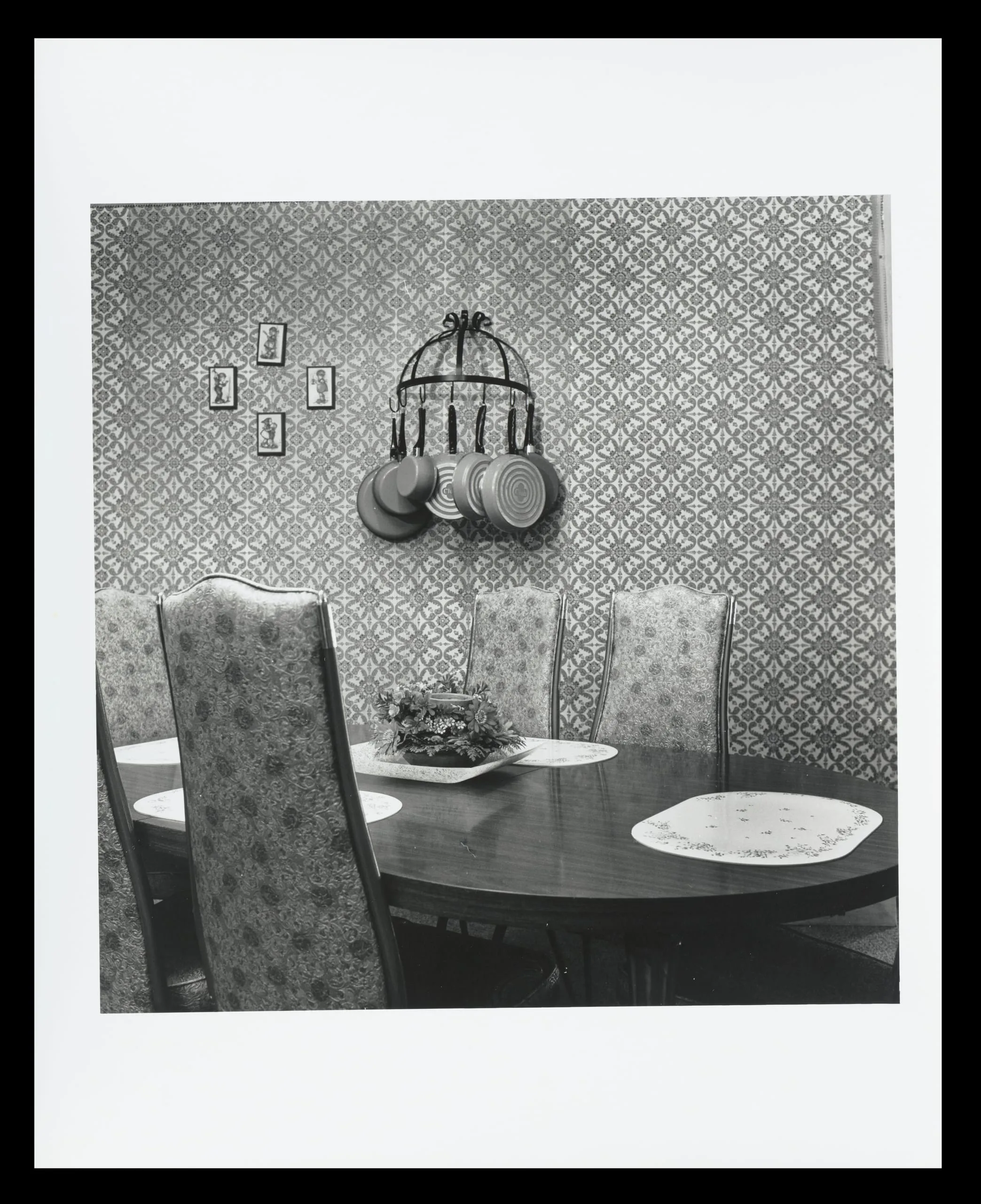 Black and white photograph of a dining room interior with patterned wallpaper, an oval table with chairs, and a wrought-iron pot rack hanging on the wall