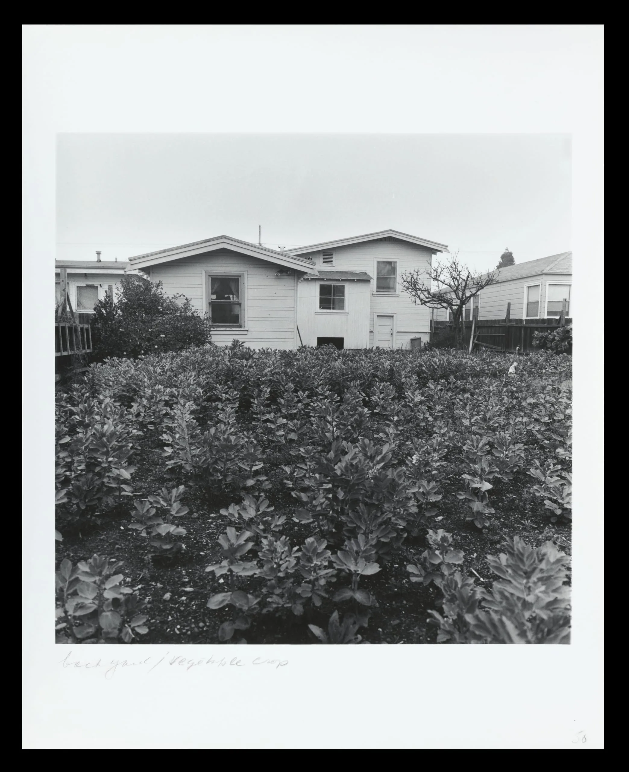 Black and white photograph of a dense backyard vegetable garden in rows, with a modest single-story house behind it and neighboring structures on either side under a flat gray sky