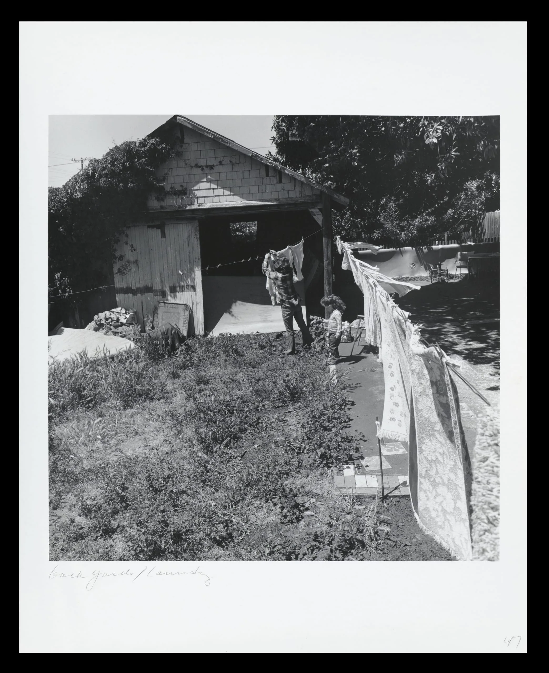 Black and white photograph of a backyard scene: adult and small child hanging laundry on a long clothesline in front of a weathered wood-shingled outbuilding