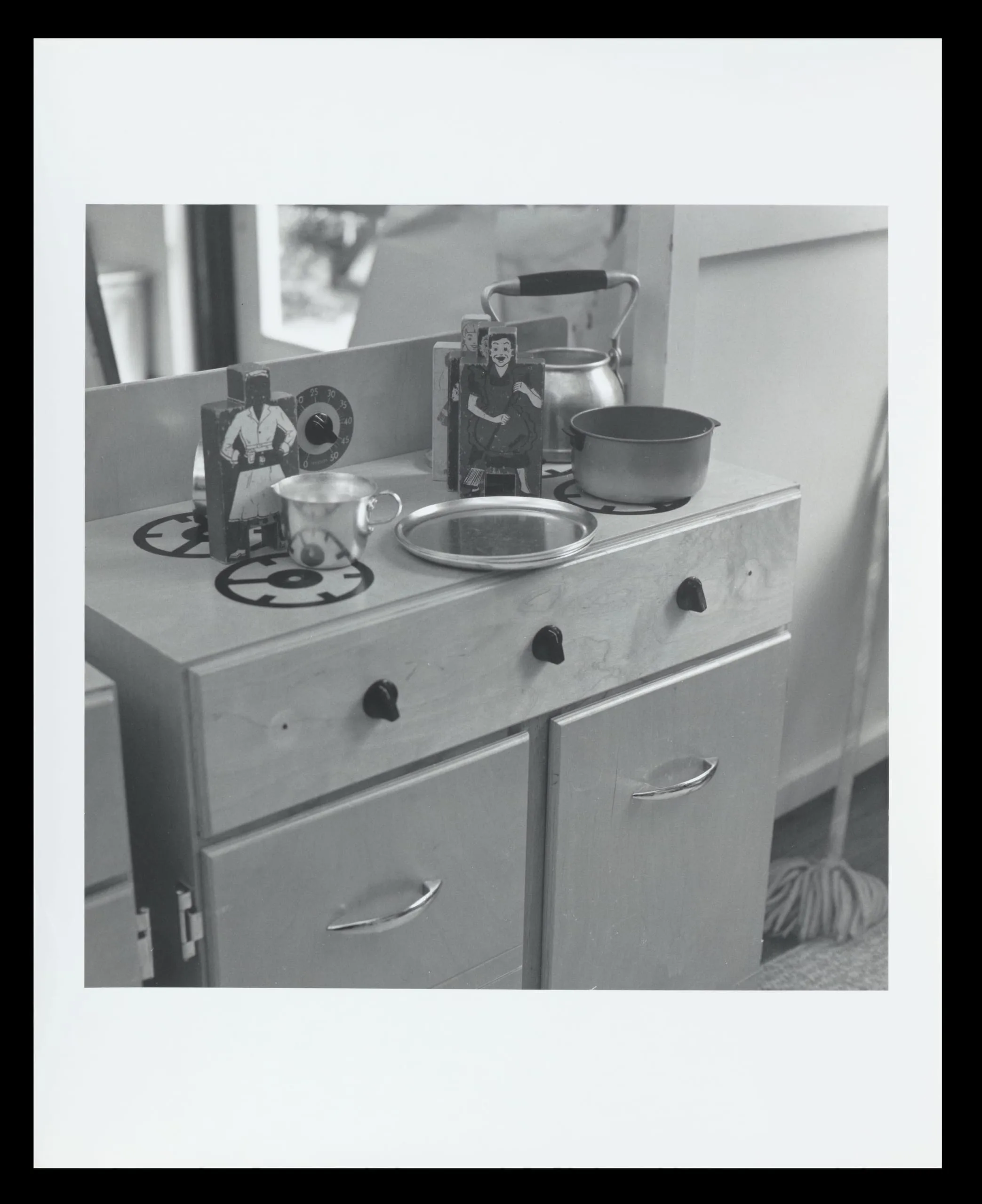Black and white photograph of a child's toy kitchen unit with miniature metal cookware, illustrated play cards, and painted burner rings on the cooktop