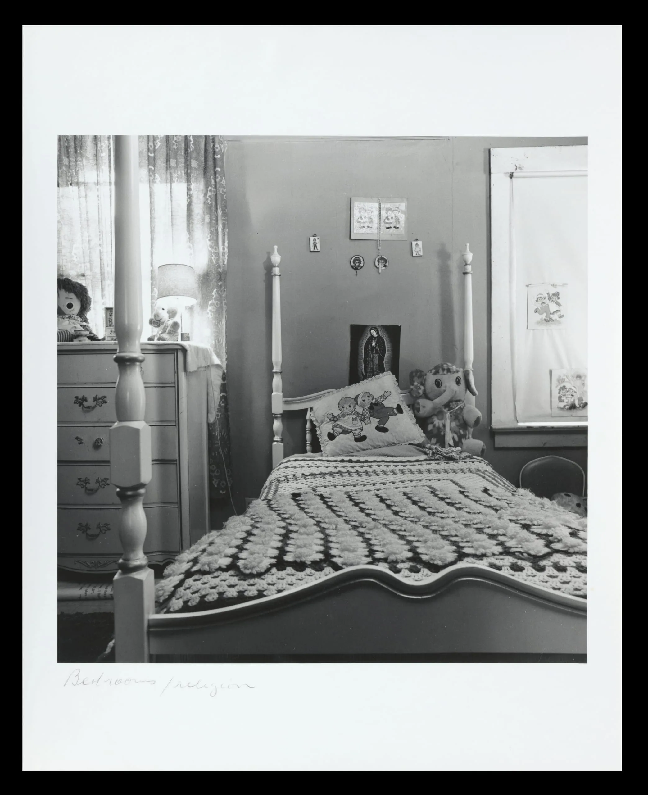 Black and white photograph of a child's bedroom with a four-poster bed covered in a crocheted rosette-patterned coverlet, stuffed animals, and religious imagery on the wall above the headboard