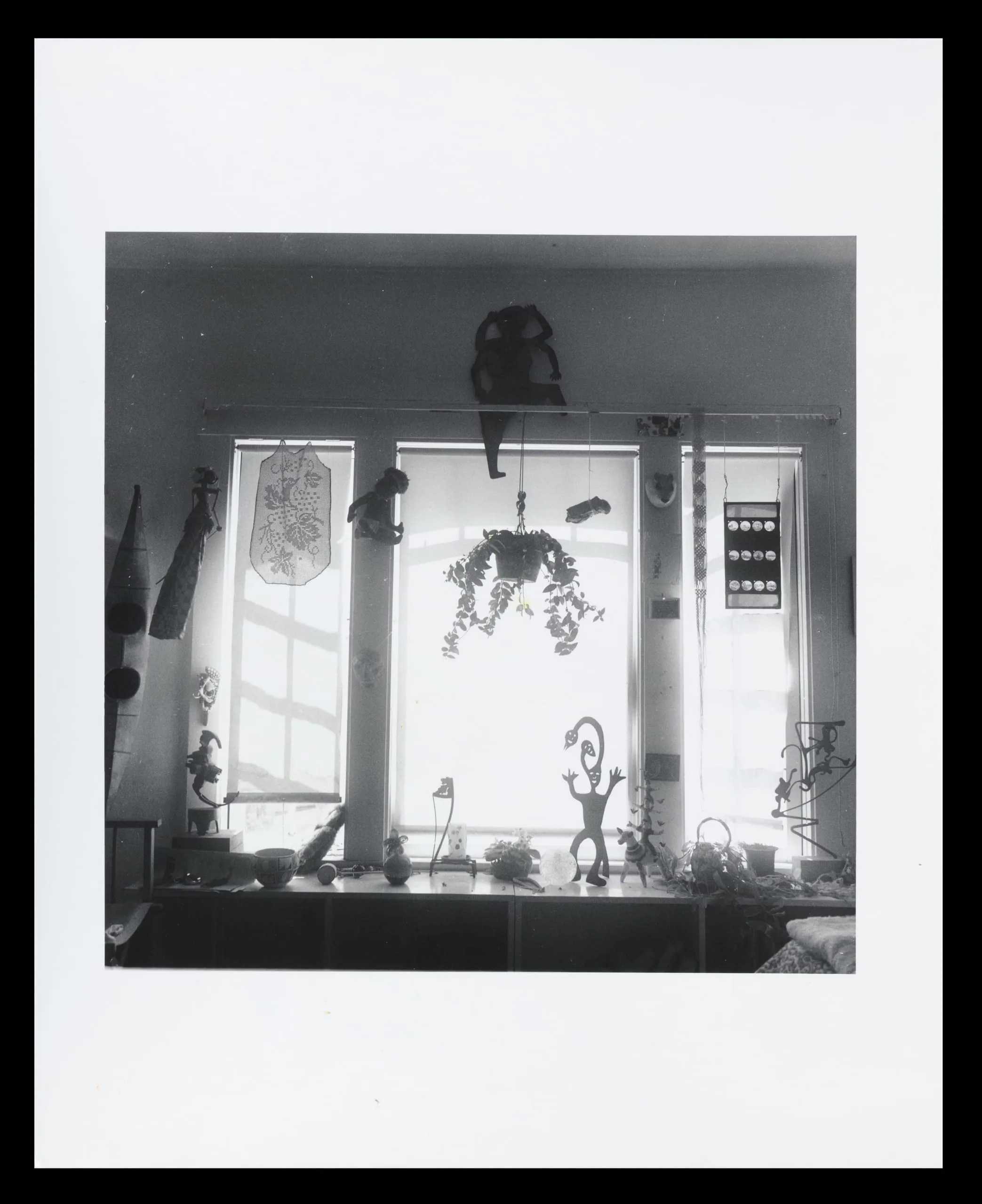 Black and white photograph of a sunlit three-paned window crowded with silhouetted figurines, potted plants, and a hanging basket, with decorative objects on surrounding walls