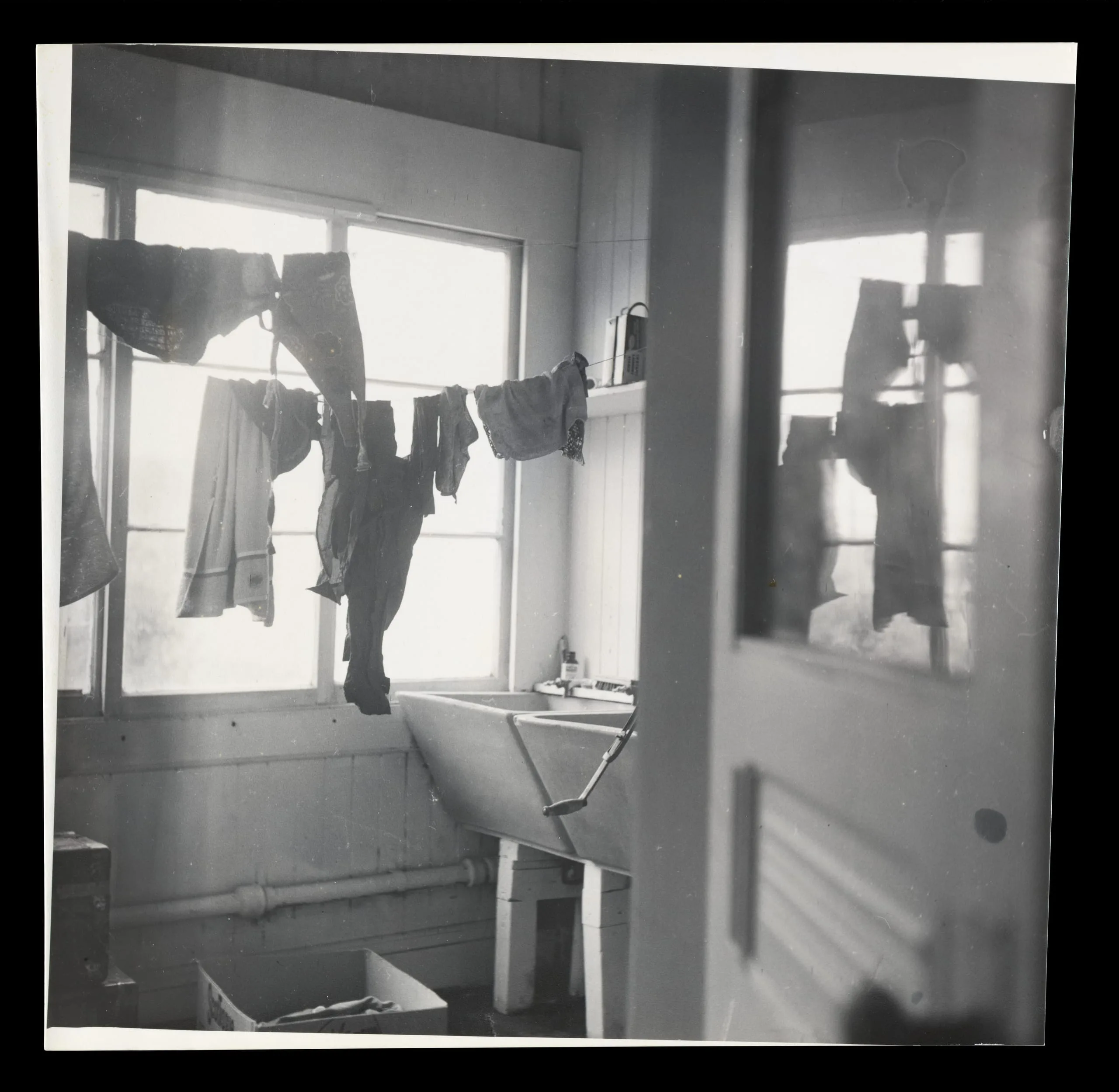 Black and white photograph of a laundry room interior seen through a doorway, with garments silhouetted on a clothesline against bright windows above a utility sink