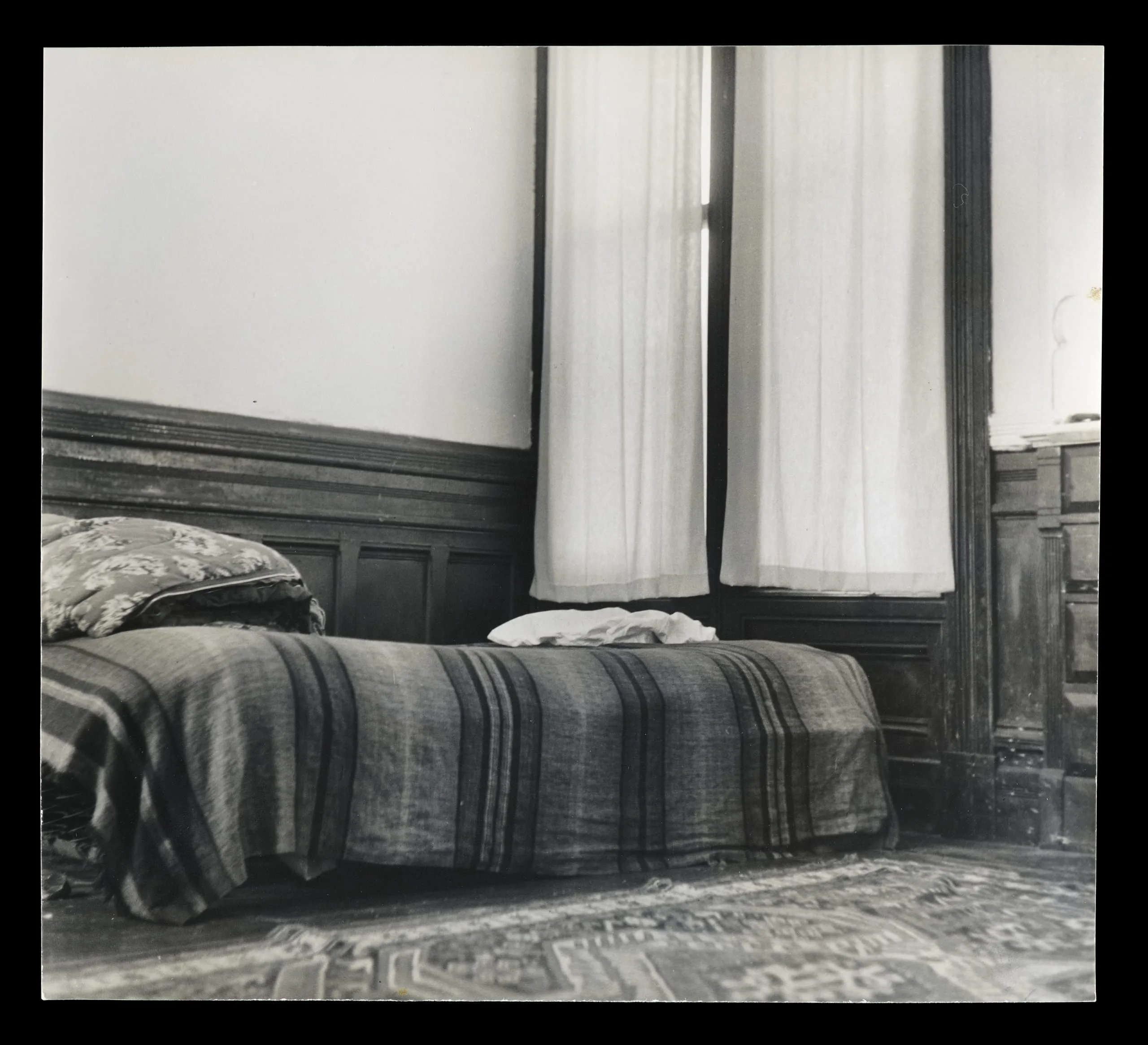 Black and white photograph of a simply made bed with striped blanket and floral pillows against dark wood paneling, a sheer curtain hanging before a tall window