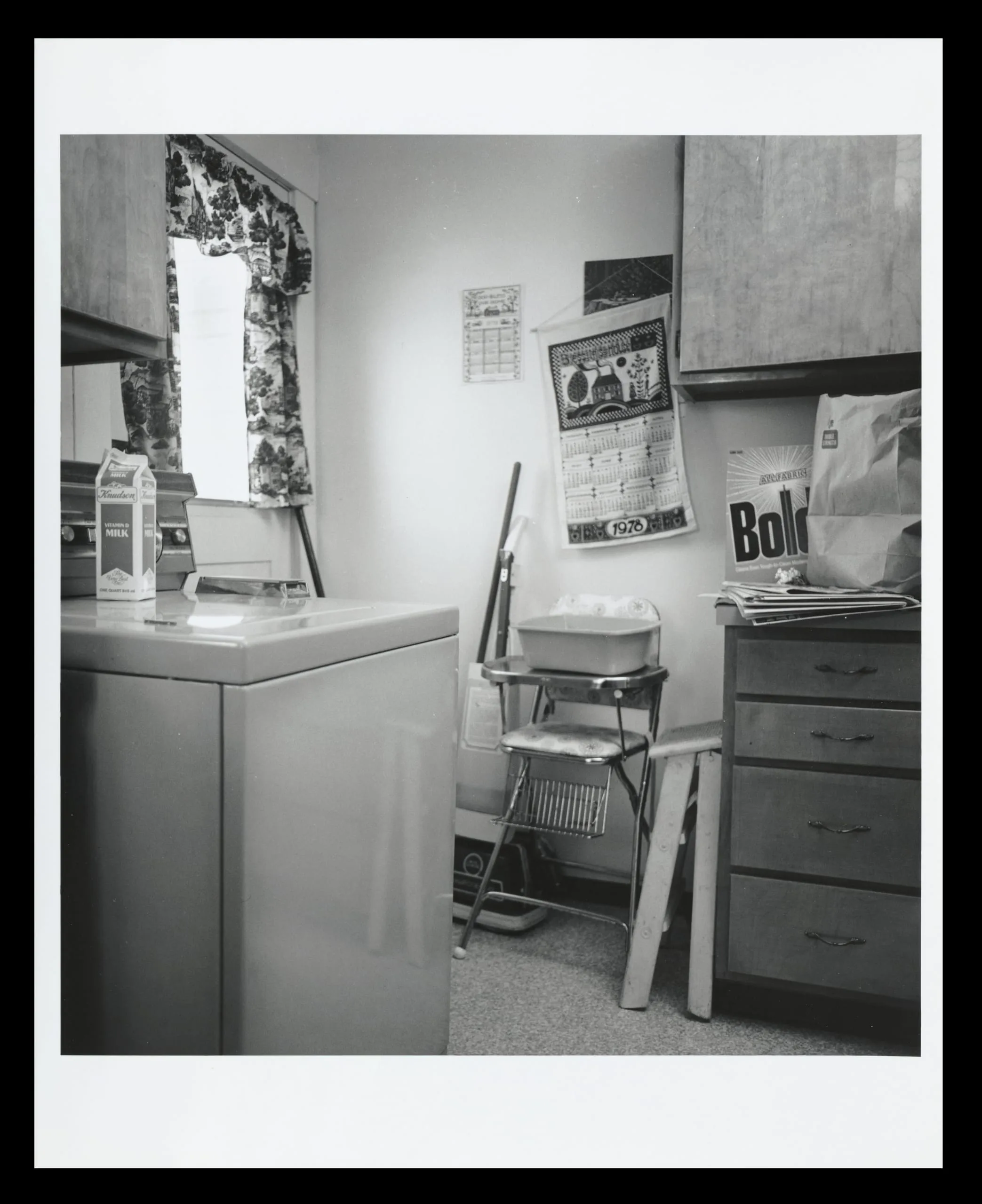 Black and white photograph of a domestic laundry room interior with a washing machine, chrome step stool, Bold detergent bag, and a 1976 calendar on the wall