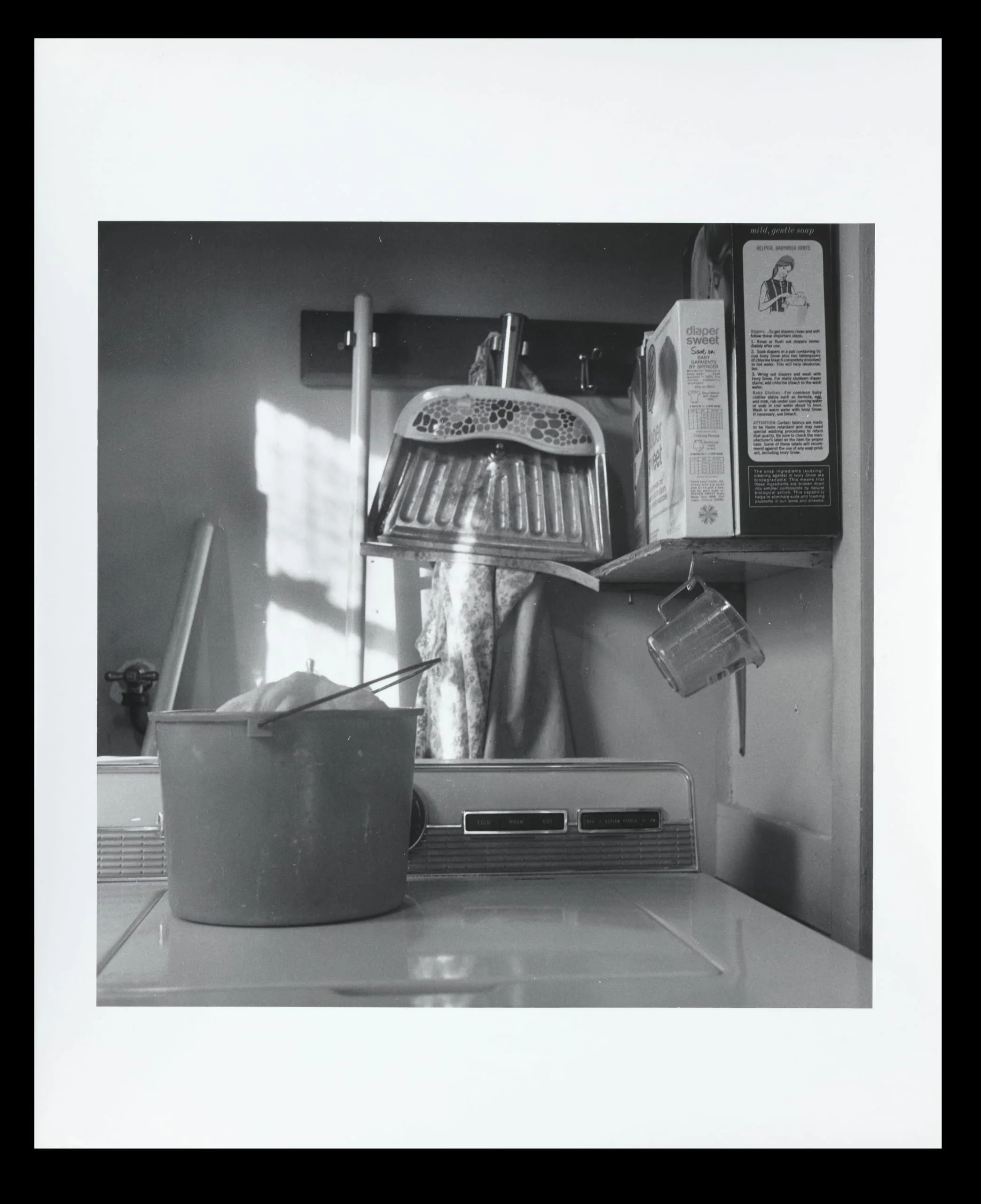 Black and white photograph of a domestic utility corner with a mop bucket, leaning dustpan, hanging cup, and shelf with household product boxes